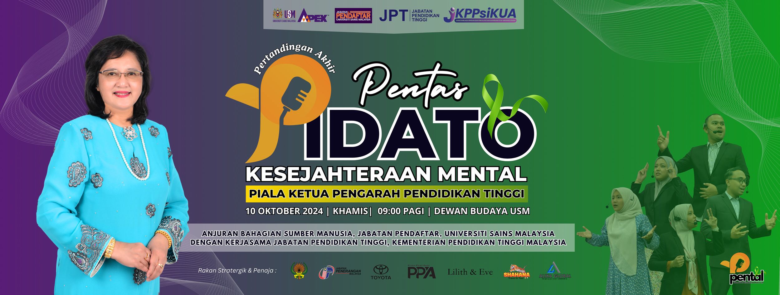 Sukacita dimaklumkan bahawa Bahagian Sumber Manusia, Jabatan Pendaftar, Universiti Sains Malaysia dengan kerjasama Jabatan Pendidikan Tinggi, Kementerian Pendidikan Tinggi Malaysia (KPT) akan menganjurkan Pertandingan Akhir Pentas Pidato Kesejahteraan Mental (PENTAL) USM 2024 Piala Ketua Pengarah Pendidikan Tinggi bersempena Sambutan Bulan Kaunseling Kebangsaan Tahun 2024 seperti ketetapan berikut :-