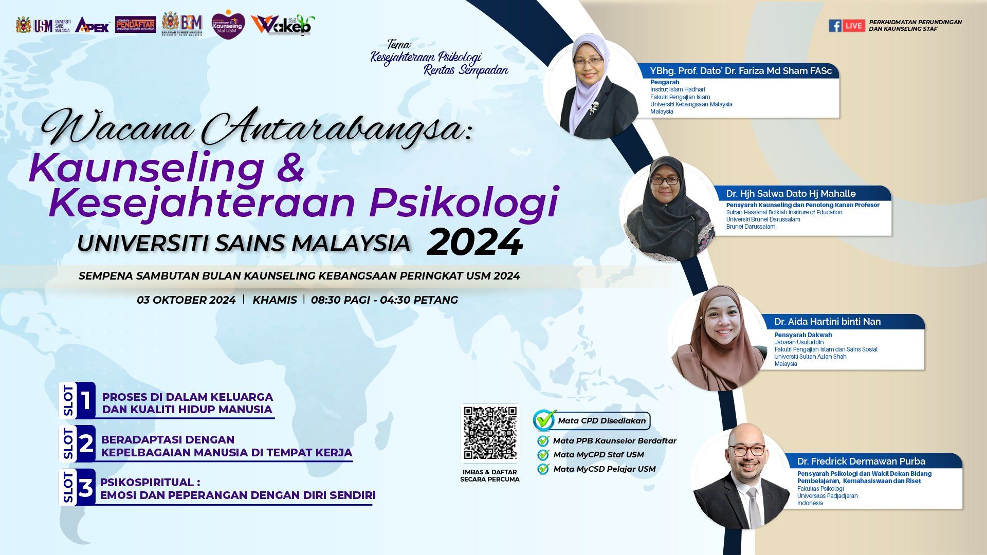 Justeru itu, penyertaan bagi wacana ini dibuka secara PERCUMA dengan pemberian mata MyCPD Staf USM, mata MyCSD Pelajar USM, mata PPB Kaunselor Berdaftar Lembaga Kaunselor Malaysia berserta e-Sijil kepada peserta yang berjaya menyertai wacana ini bagi KETIGA-TIGA SESI.