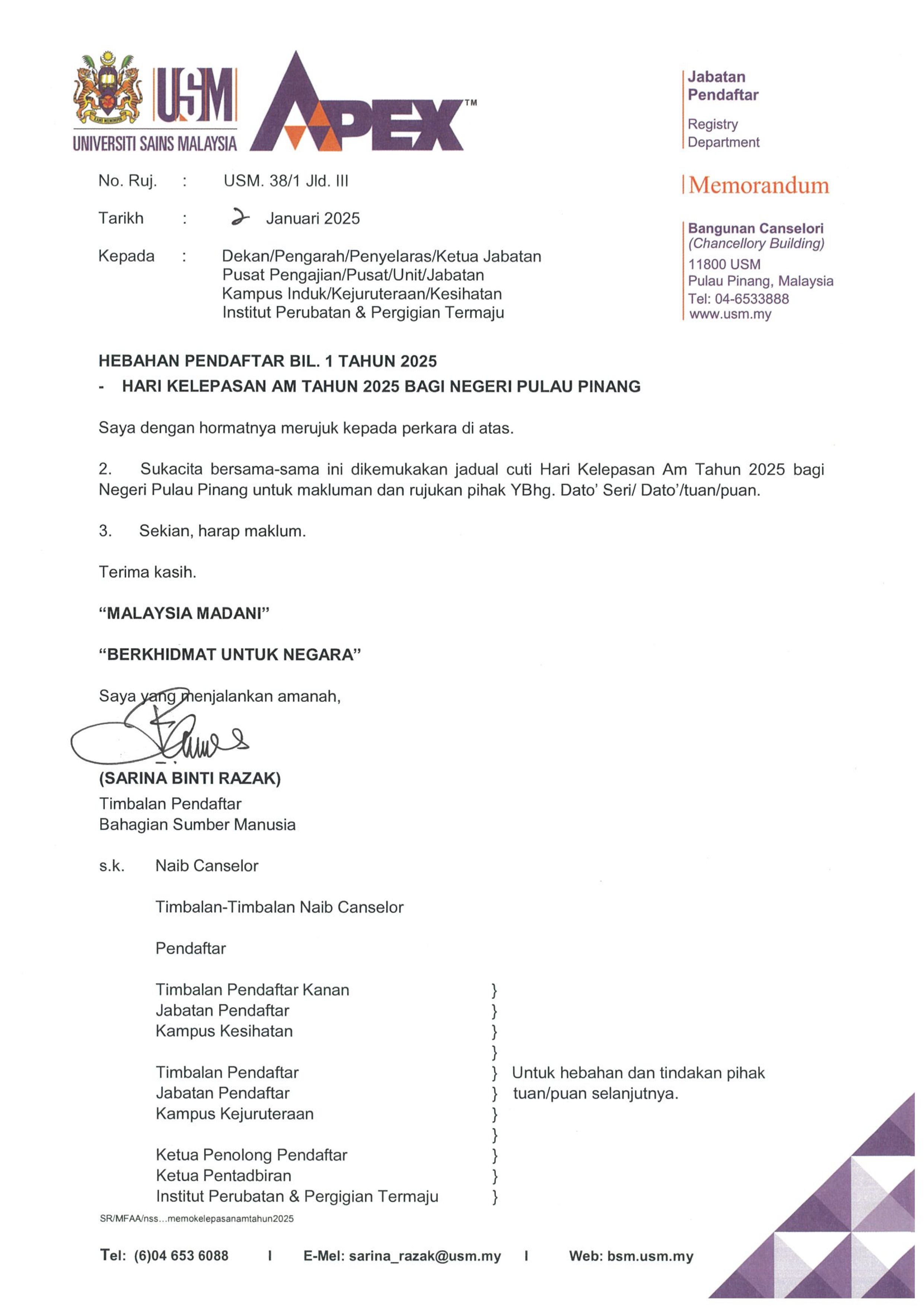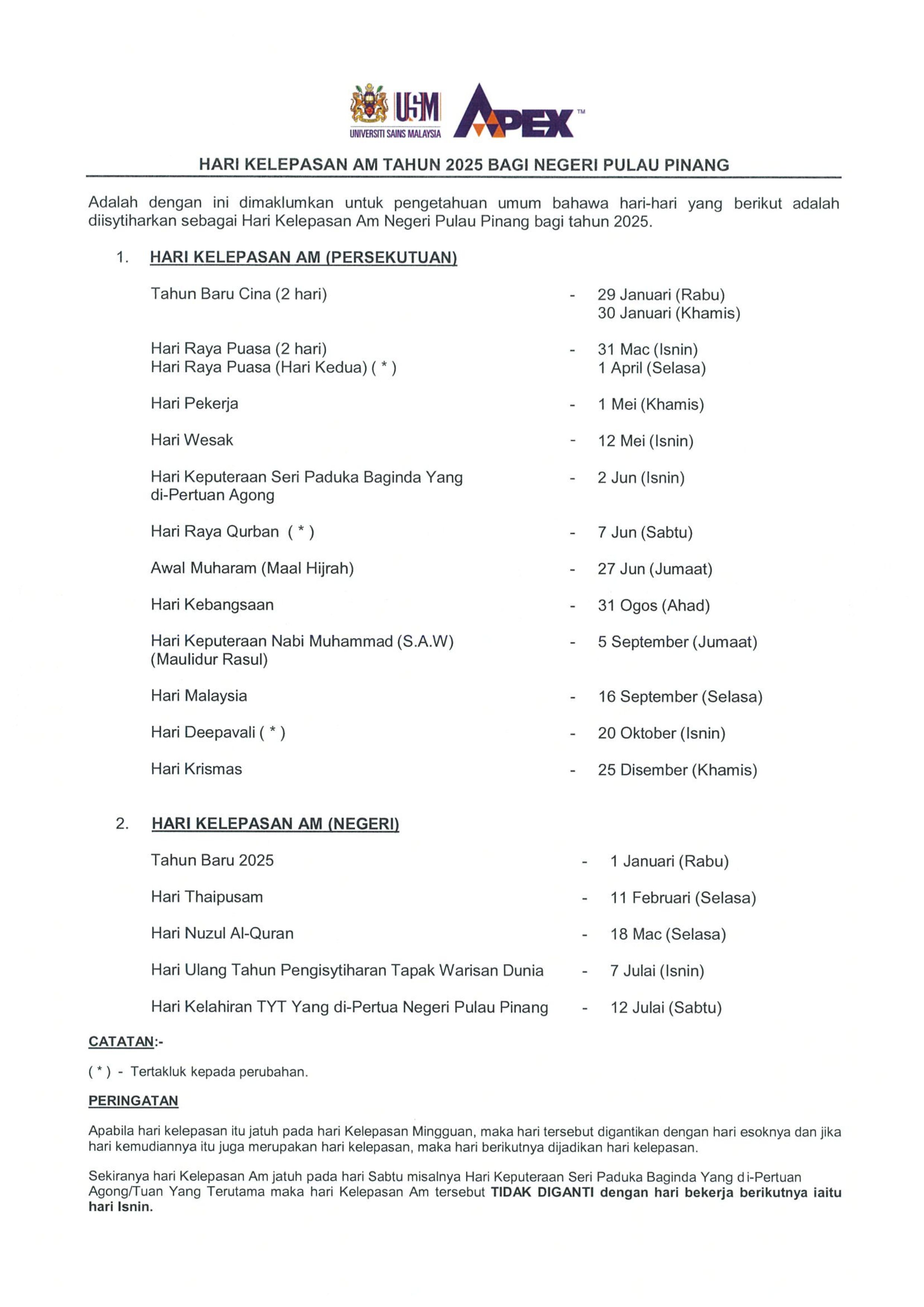 • HEBAHAN PENDAFTAR BIL. 1 TAHUN 2025 : HARI KELEPASAN AM TAHUN 2025 BAGI NEGERI PULAU PINANG