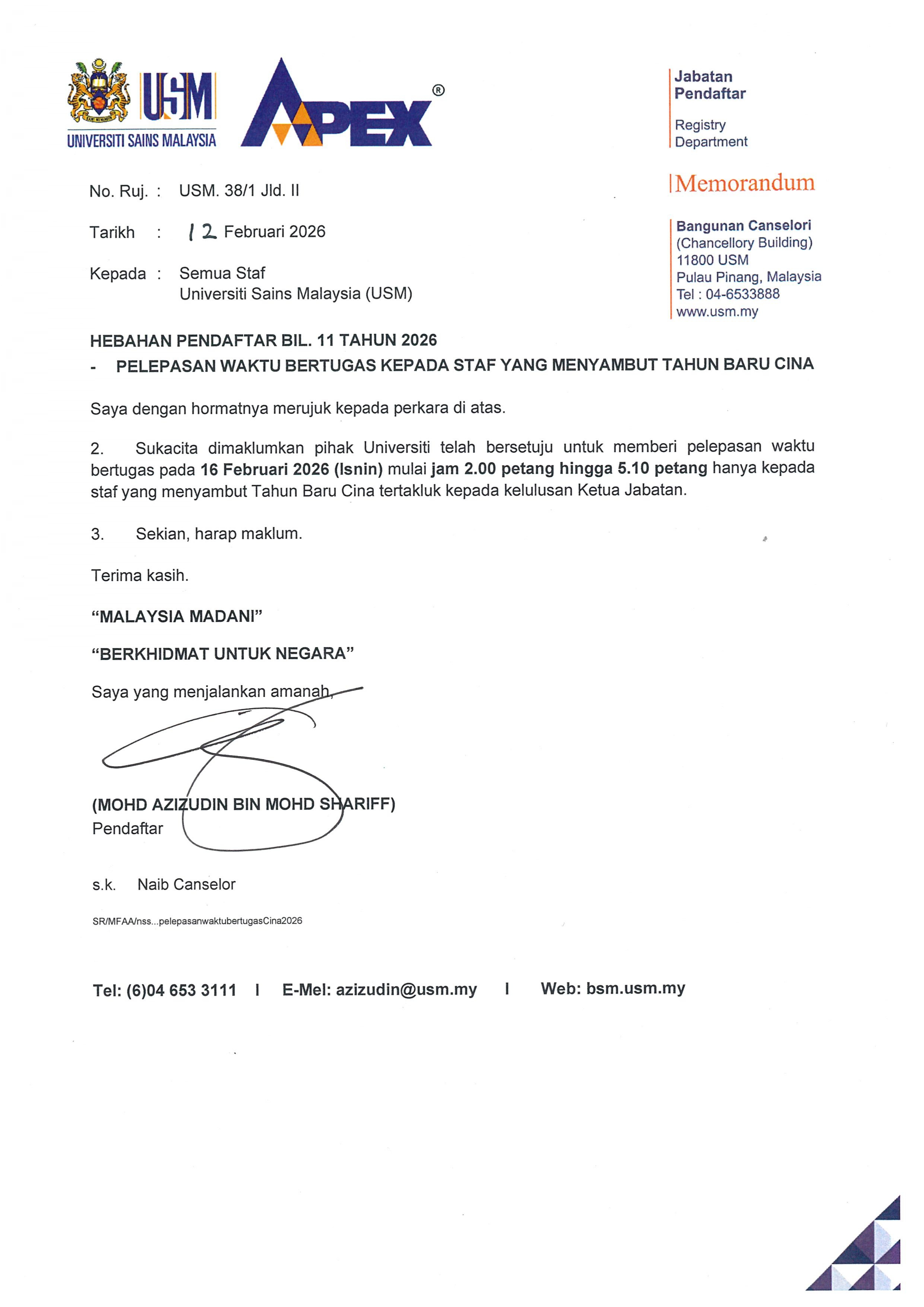 • HEBAHAN PENDAFTAR BIL. 11 TAHUN 2026-PELEPASAN WAKTU BERTUGAS KEPADA STAF YANG MENYAMBUT TAHUN BARU CINA