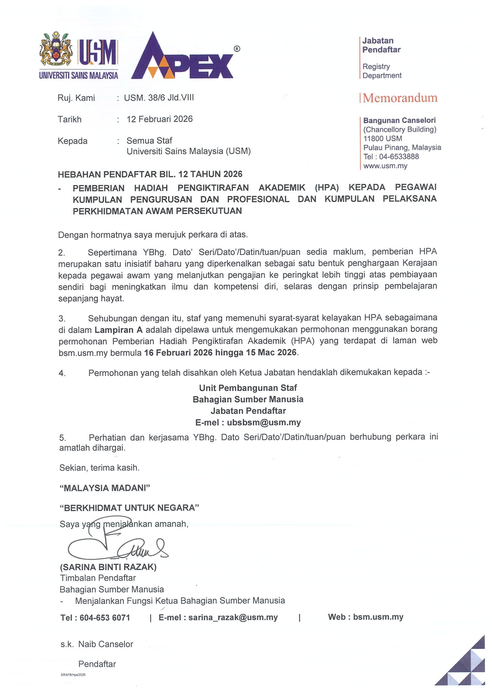 • HEBAHAN PENDAFTAR BIL. 12 TAHUN 2026 - PEMBERIAN HADIAH PENGIKTIRAFAN AKADEMIK (HPA) KEPADA PEGAWAI KUMPULAN PENGURUSAN & PROFESIONAL DAN KUMPULAN PELAKSANA PERKHIDMATAN AWAM PERSEKUTUAN