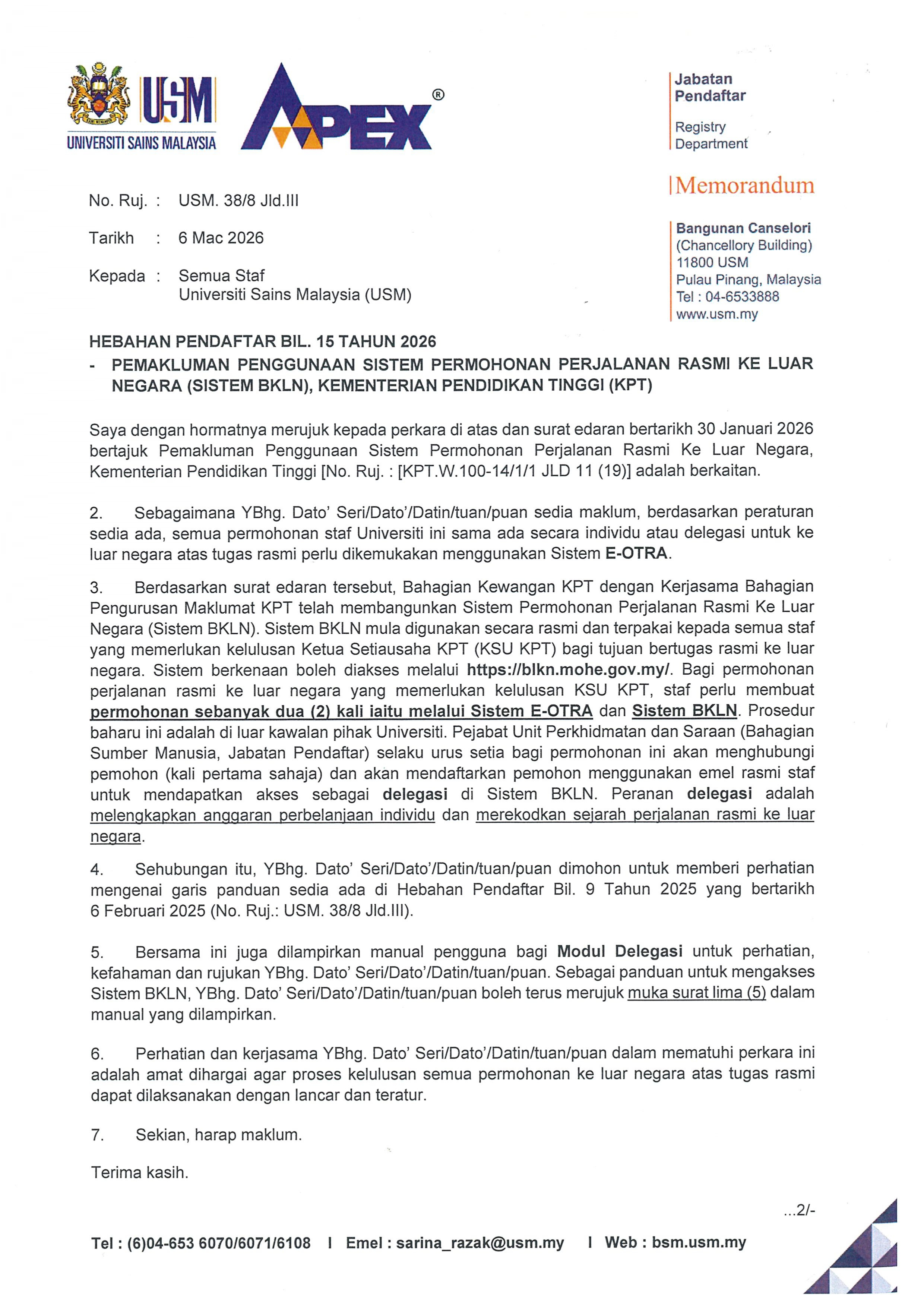 • HEBAHAN PENDAFTAR BIL. 15 TAHUN 2026 - PEMAKLUMAN PENGGUNAAN SISTEM PERMOHONAN PERJALANAN RASMI KE LUAR NEGARA (SISTEM BKLN), KEMENTERIAN PENDIDIKAN TINGGI (KPT)