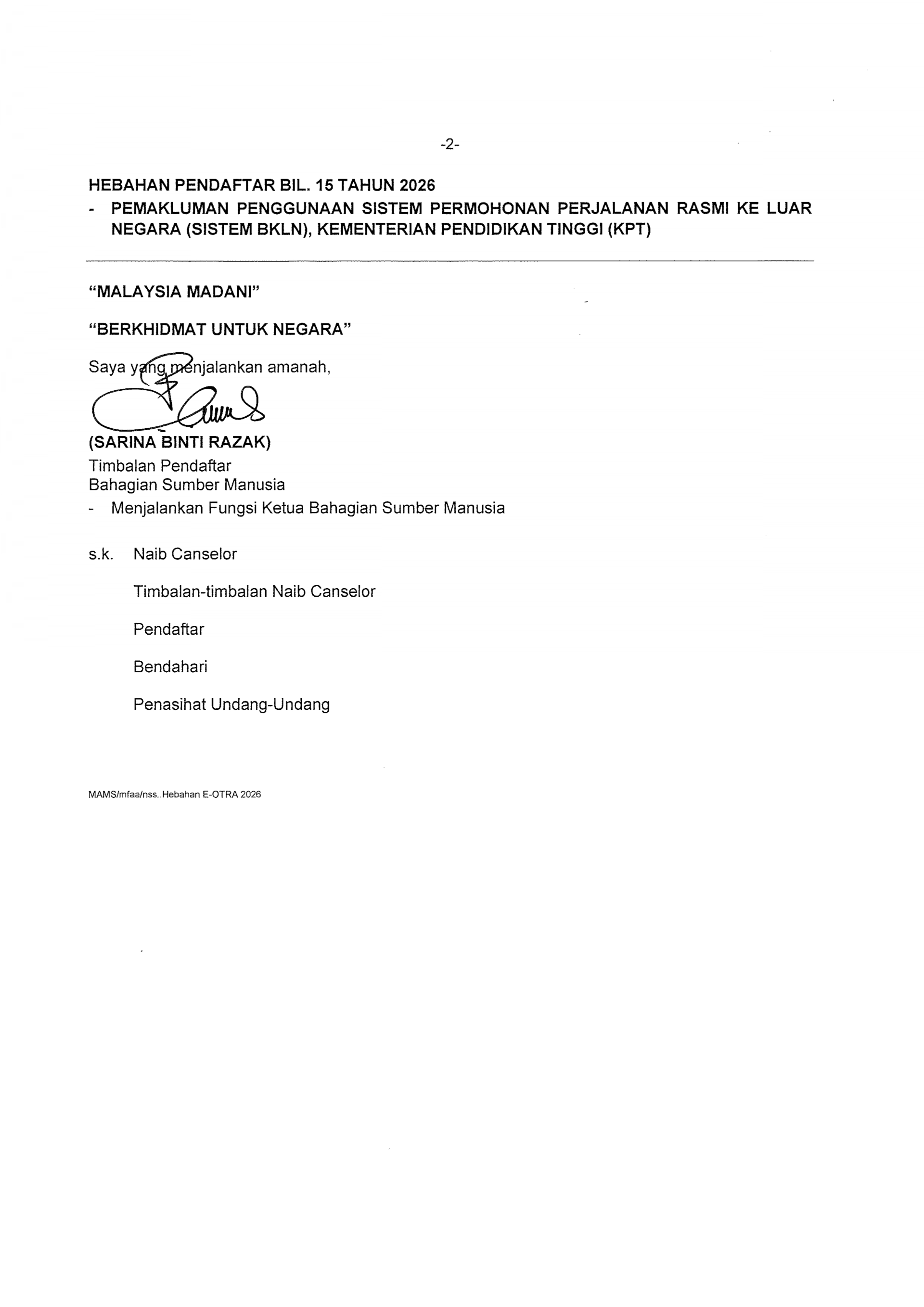 HEBAHAN PENDAFTAR BIL. 15 TAHUN 2026 - PEMAKLUMAN PENGGUNAAN SISTEM PERMOHONAN PERJALANAN RASMI KE LUAR NEGARA (SISTEM BKLN), KEMENTERIAN PENDIDIKAN TINGGI (KPT)