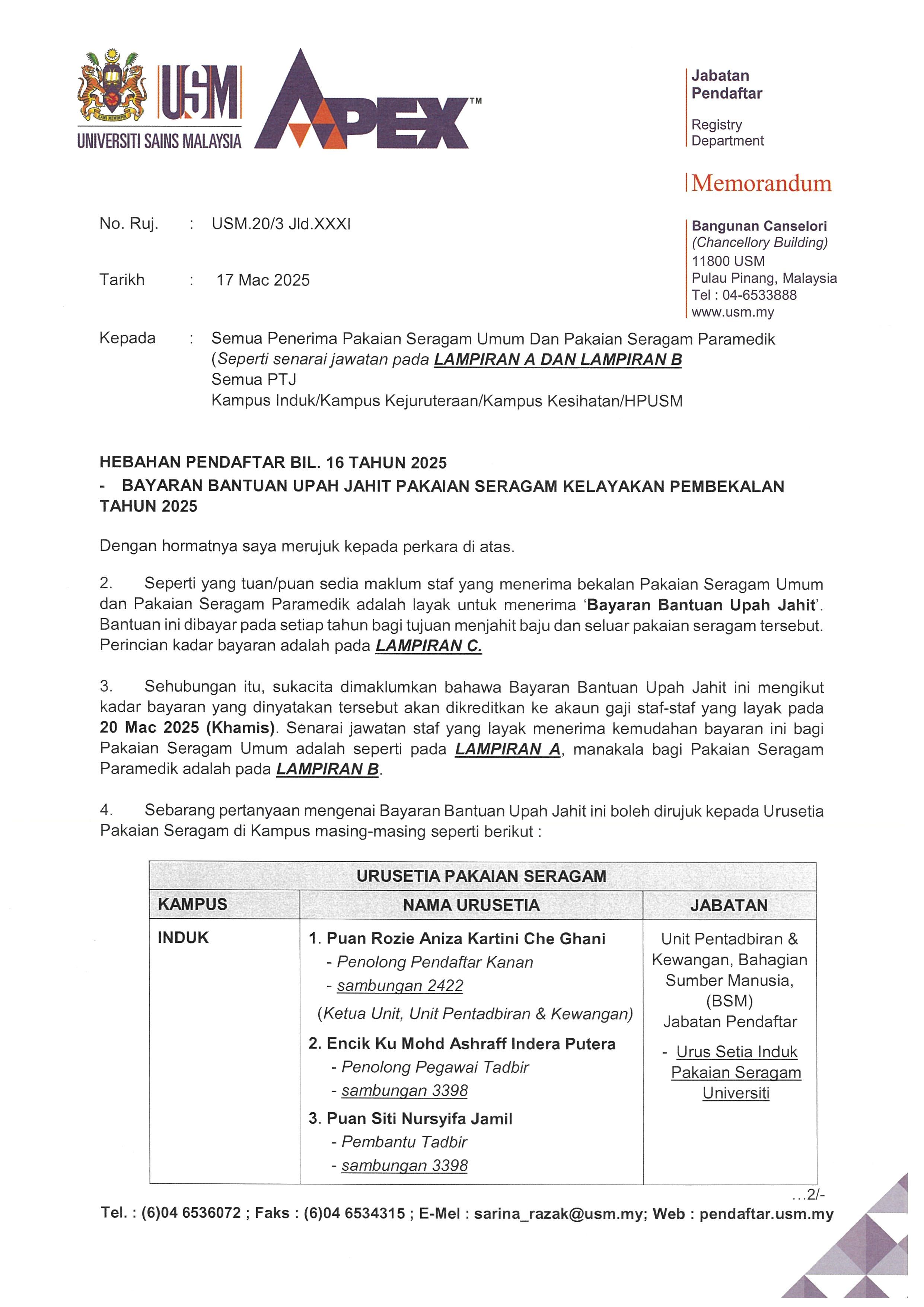 HEBAHAN PENDAFTAR BIL. 16 TAHUN 2025 - BAYARAN BANTUAN UPAH JAHIT PAKAIAN SERAGAM KELAYAKAN PEMBEKALAN TAHUN 2025