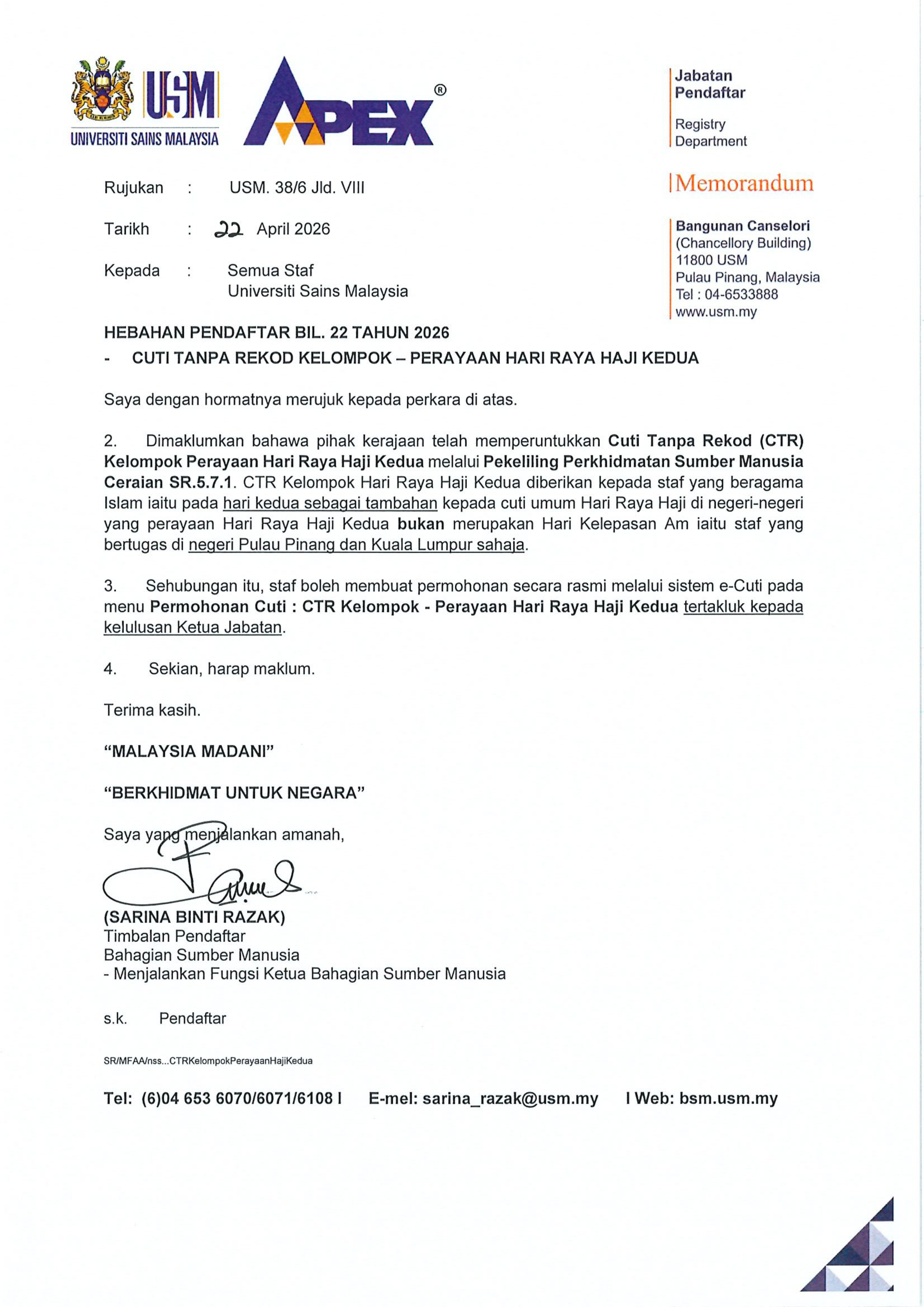 • HEBAHAN PENDAFTAR BIL. 22 TAHUN 2026 - CUTI TANPA REKOD KELOMPOK - PERAYAAN HARI RAYA HAJI KEDUA