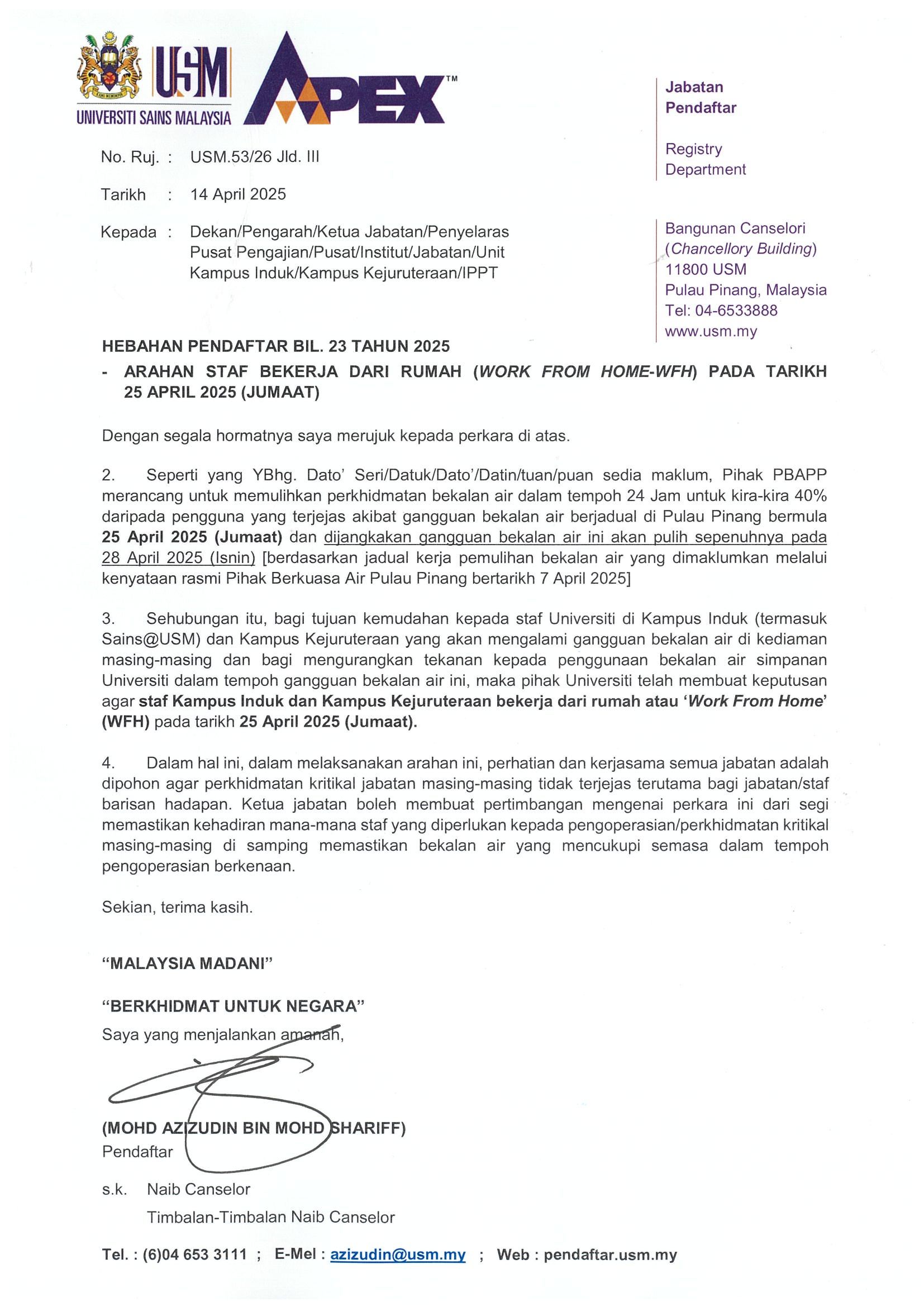 HEBAHAN PENDAFTAR BIL. 23 TAHUN 2025 - ARAHAN STAF BEKERJA DARI RUMAH (WORK FROM HOME) PADA TARIKH 25 APRIL 2025 (JUMAAT)
