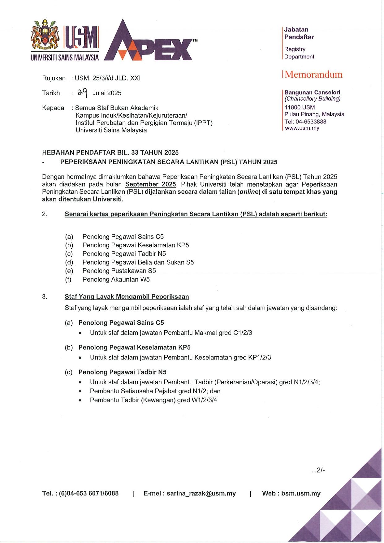 HEBAHAN PENDAFTAR BIL. 33 TAHUN 2025 : PEPERIKSAAN PENINGKATAN SECARA LANTIKAN (PSL) TAHUN 2025