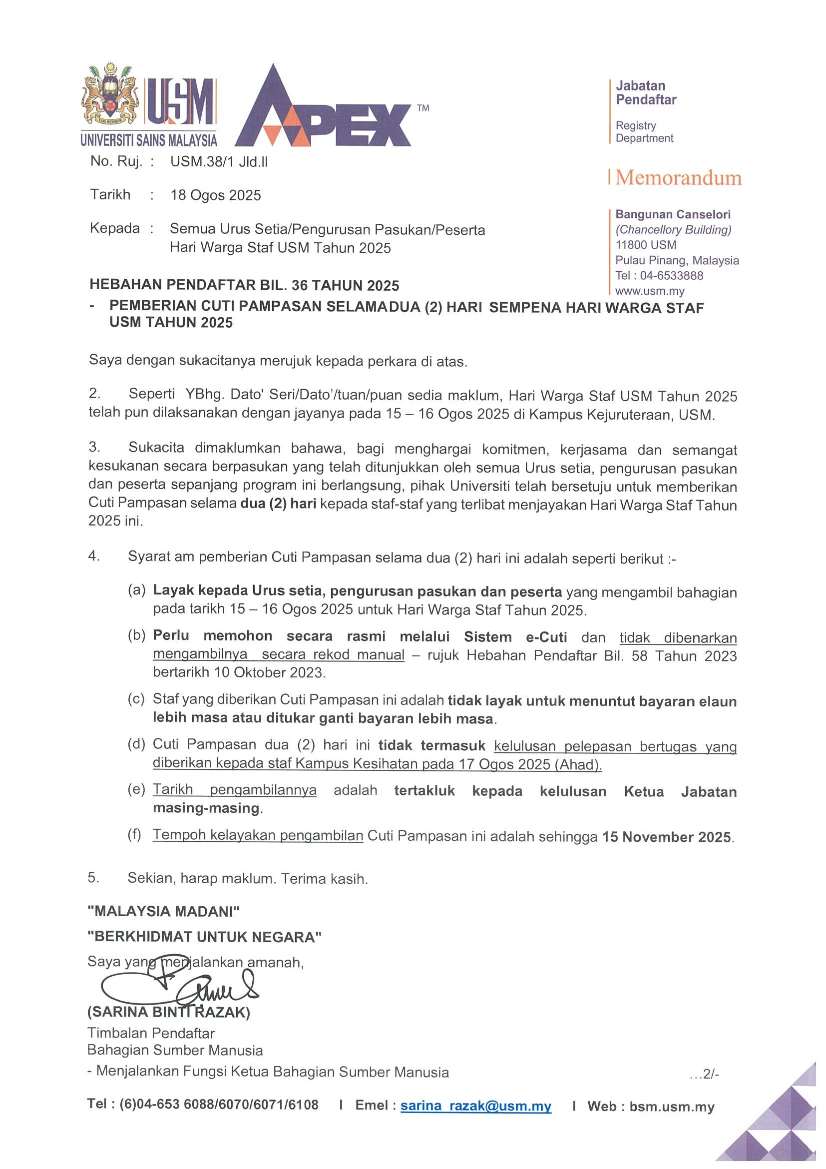 HEBAHAN PENDAFTAR BIL. 36 TAHUN 2025 : PEMBERIAN CUTI PAMPASAN SELAMA DUA (2) HARI SEMPENA HARI WARGA STAF USM TAHUN 2025