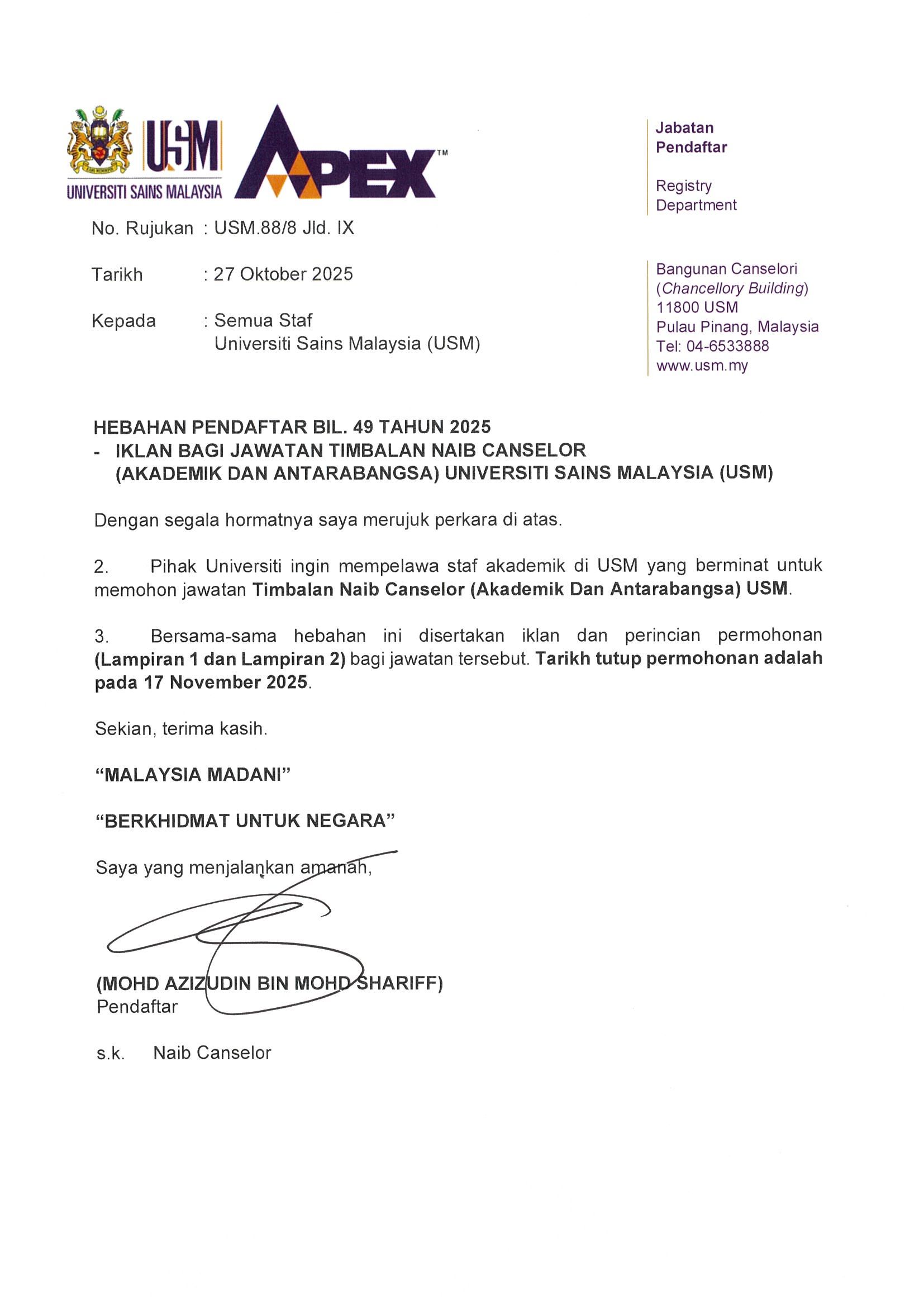 • HEBAHAN PENDAFTAR BIL. 49 TAHUN 2025 : IKLAN BAGI JAWATAN TIMBALAN NAIB CANSELOR (AKADEMIK DAN ANTARABANGSA) UNIVERSITI SAINS MALAYSIA (USM)