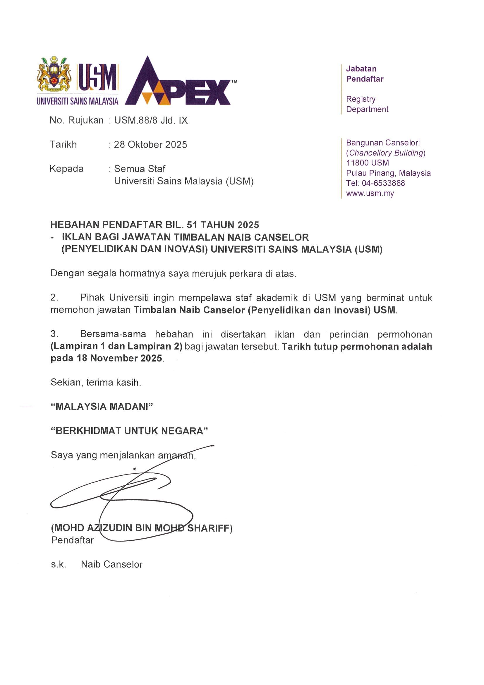 • HEBAHAN PENDAFTAR BIL. 51 TAHUN 2025 : IKLAN BAGI JAWATAN TIMBALAN NAIB CANSELOR (PENYELIDIKAN DAN INOVASI) UNIVERSITI SAINS MALAYSIA (USM)