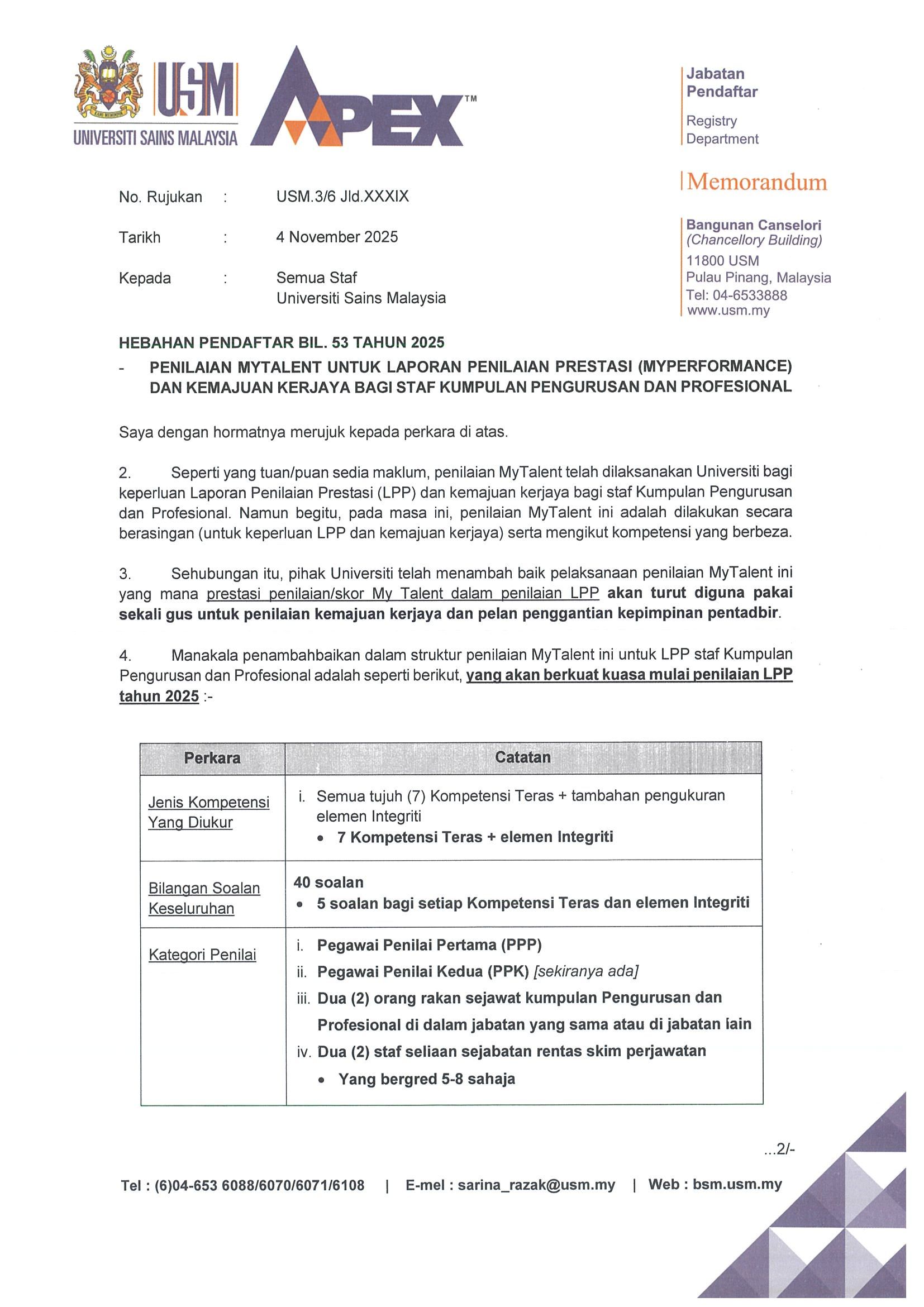 HEBAHAN PENDAFTAR BIL. 53 TAHUN 2025 : PENILAIAN MYTALENT UNTUK LAPORAN PENILAIAN PRESTASI (MYPERFORMANCE) DAN KEMAJUAN KERJAYA BAGI STAF KUMPULAN PENGURUSAN DAN PROFESIONAL