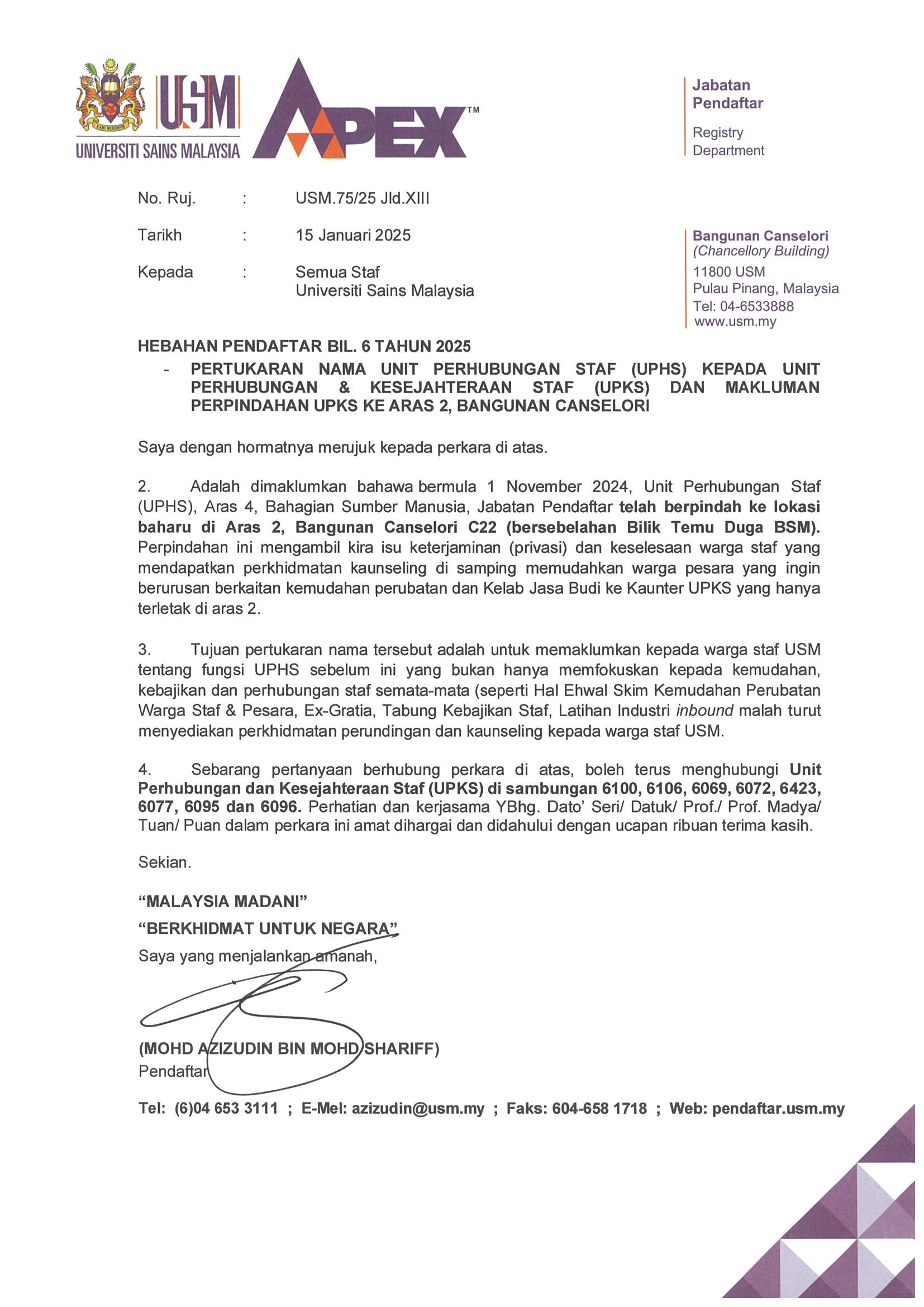 HEBAHAN PENDAFTAR BIL. 6 TAHUN 2025 : PERTUKARAN NAMA UNIT PERHUBUNGAN STAF (UPHS) KEPADA UNIT PERHUBUNGAN & KESEJAHTERAAN STAF (UPKS) DAN MAKLUMAN PERPINDAHAN UPKS KE ARAS 2, BANGUNAN CANSELORI