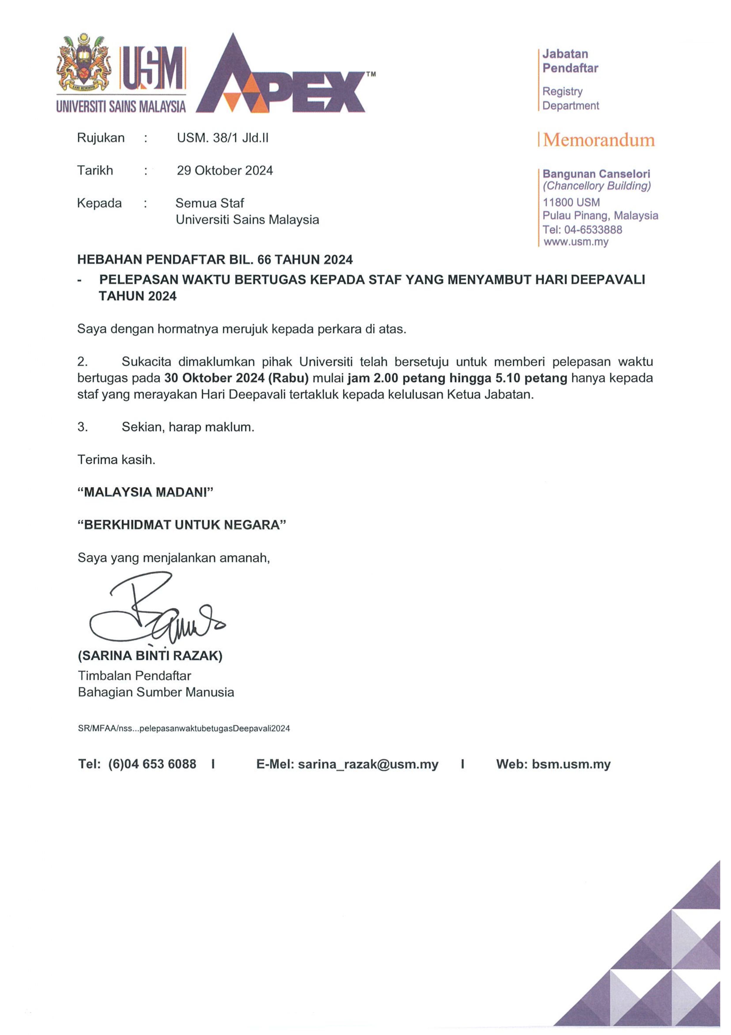• HEBAHAN PENDAFTAR BIL. 66 TAHUN 2024 : PELEPASAN WAKTU BERTUGAS KEPADA STAF YANG MENYAMBUT HARI DEEPAVALI TAHUN 2024