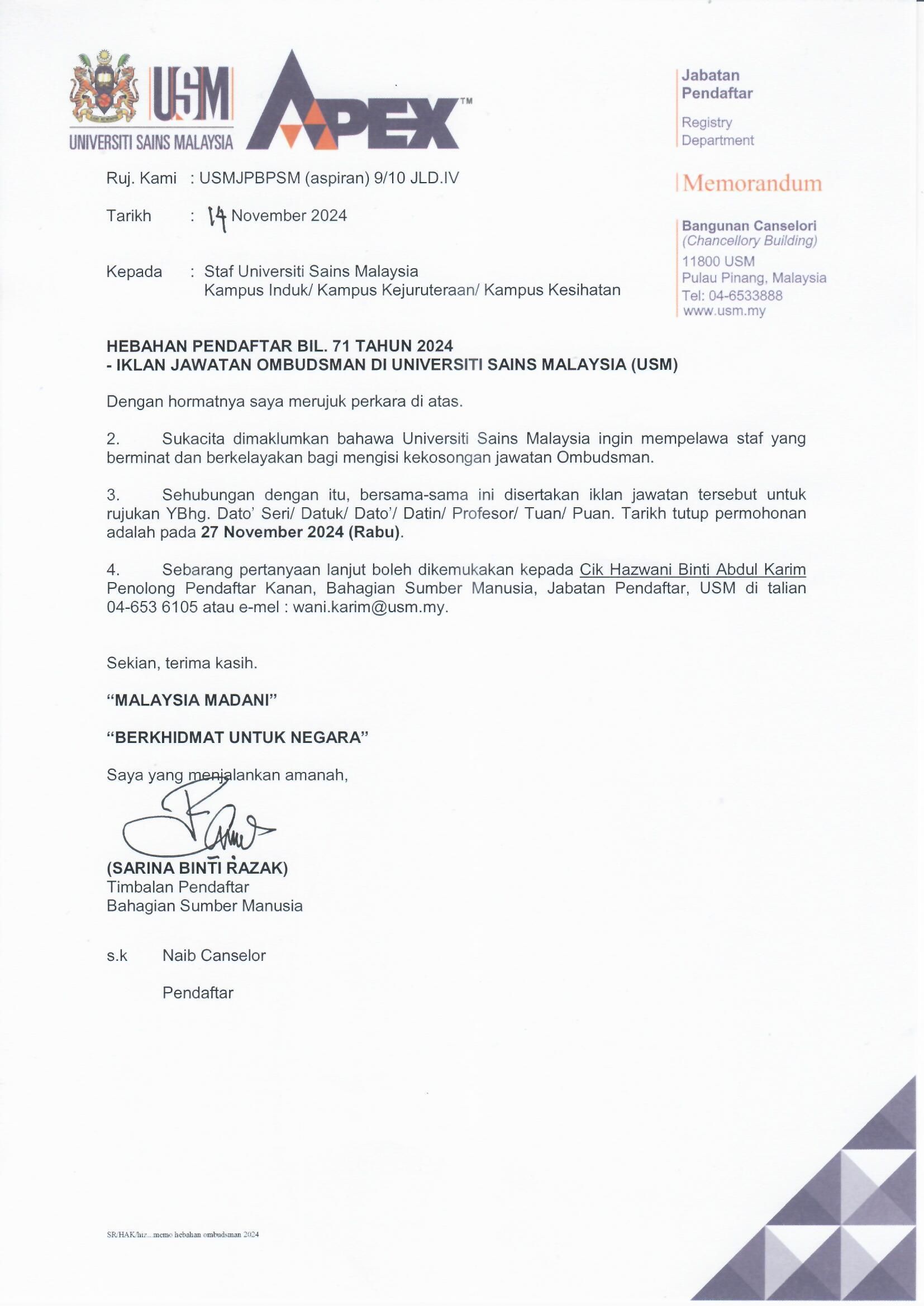 • HEBAHAN PENDAFTAR BIL. 71 TAHUN 2024 : IKLAN JAWATAN OMBUDSMAN DI UNIVERSITI SAINS MALAYSIA (USM)