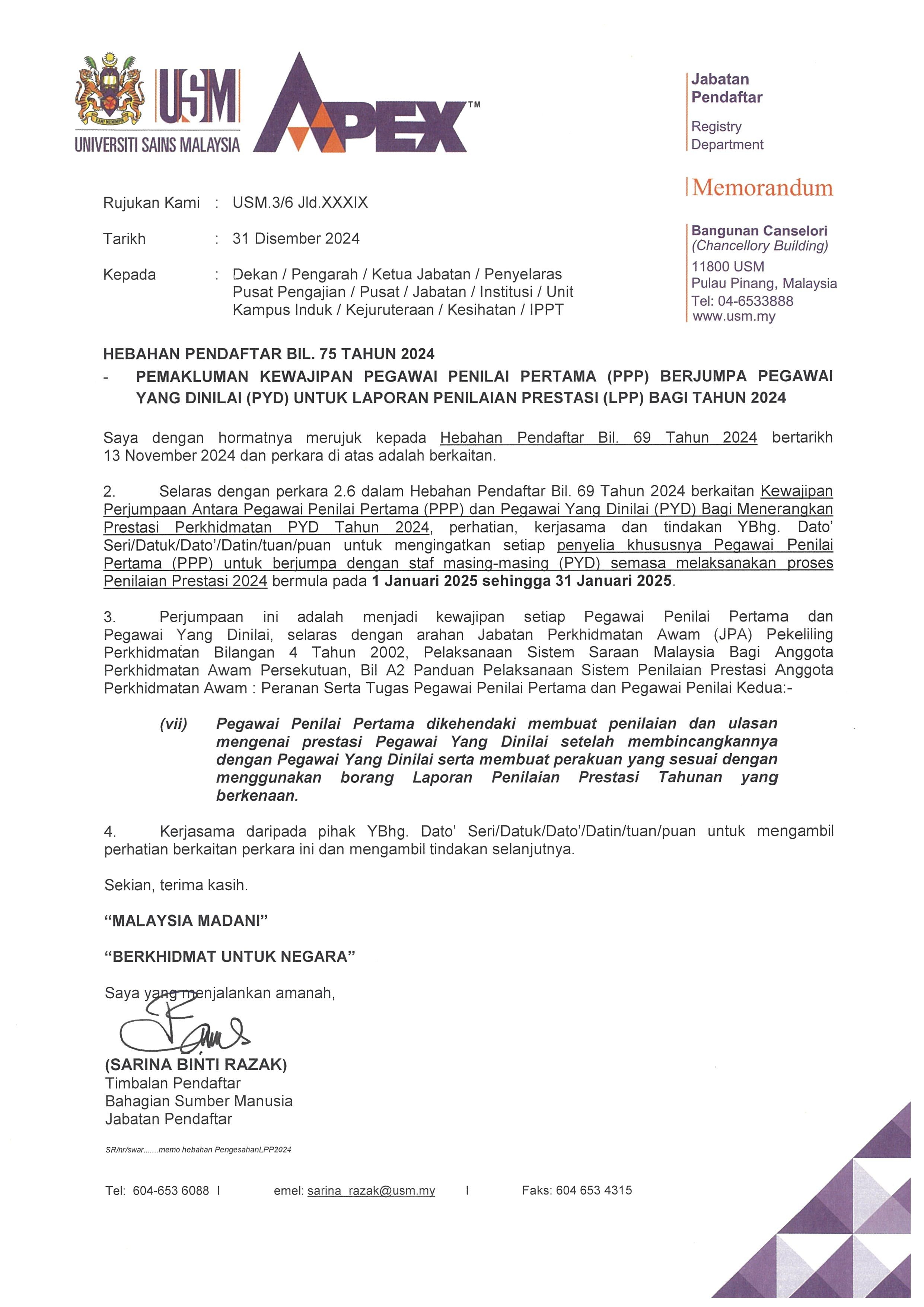 HEBAHAN PENDAFTAR BIL. 75 TAHUN 2024 : PEMAKLUMAN KEWAJIPAN PEGAWAI PENILAI PERTAMA (PPP) BERJUMPA PEGAWAI YANG DINILAI (PYD) UNTUK LAPORAN PENILAIAN PRESTASI (LPP) BAGI TAHUN 2024