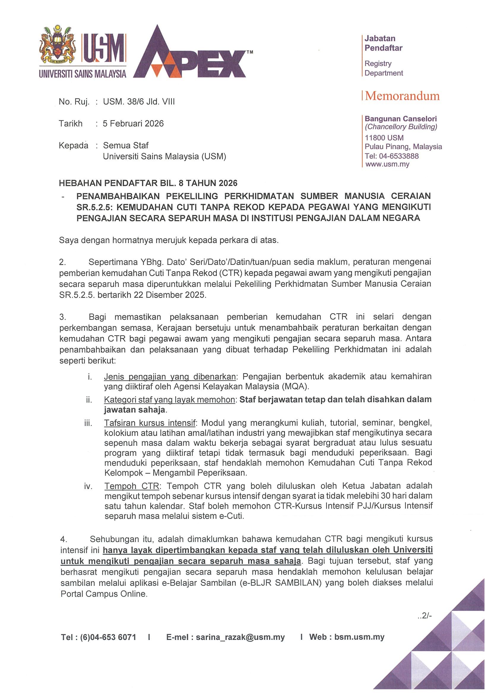 • HEBAHAN PENDAFTAR BIL. 8 TAHUN 2026 - PENAMBAHBAIKAN PEKELILING PERKHIDMATAN SUMBER MANUSIA CERAIAN SR.5.2.5: KEMUDAHAN CUTI TANPA REKOD KEPADA PEGAWAI YANG MENGIKUTI PENGAJIAN SECARA SEPARUH MASA DI INSTITUSI PENGAJIAN DALAM NEGARA