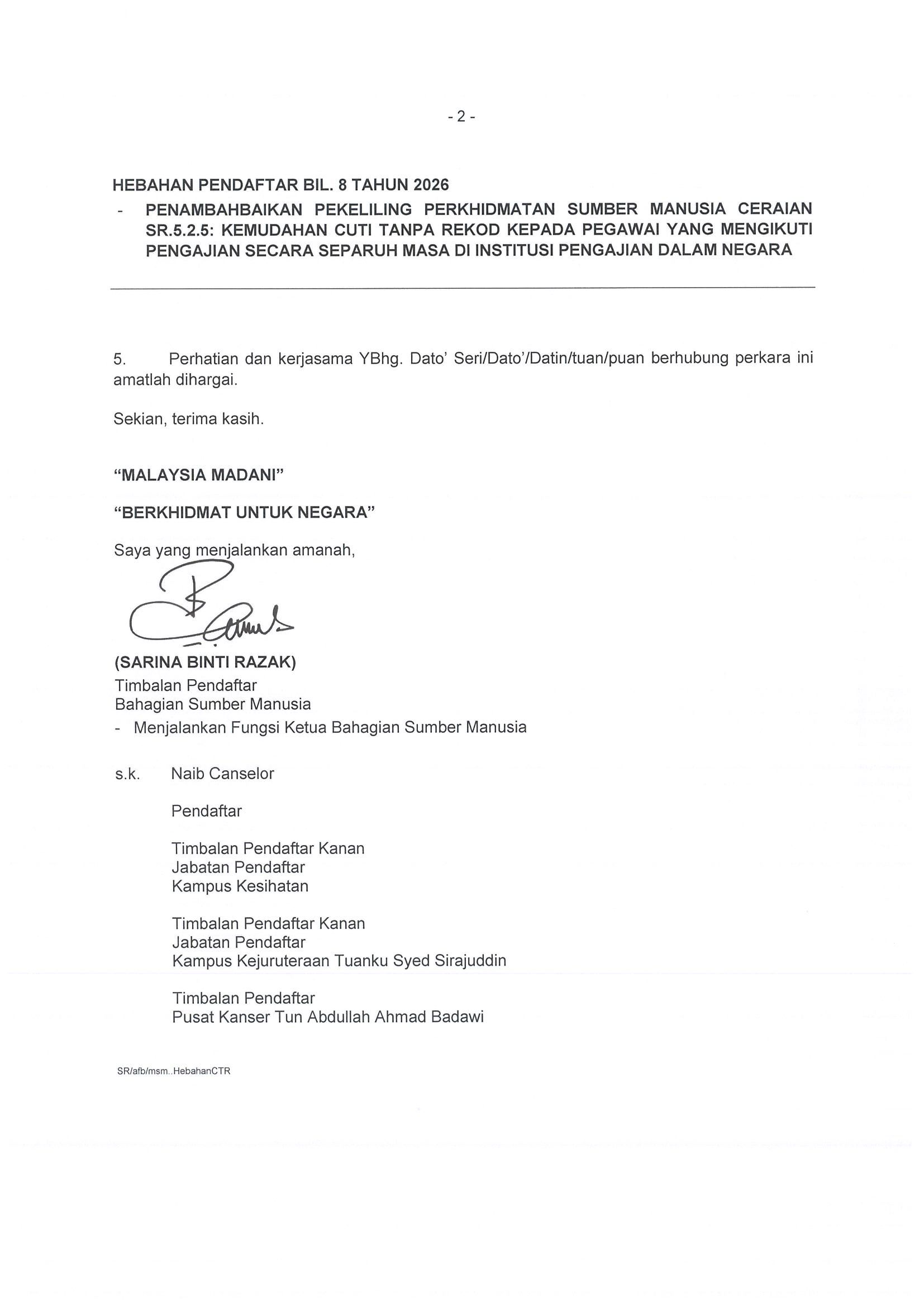 HEBAHAN PENDAFTAR BIL. 8 TAHUN 2026 - PENAMBAHBAIKAN PEKELILING PERKHIDMATAN SUMBER MANUSIA CERAIAN SR.5.2.5: KEMUDAHAN CUTI TANPA REKOD KEPADA PEGAWAI YANG MENGIKUTI PENGAJIAN SECARA SEPARUH MASA DI INSTITUSI PENGAJIAN DALAM NEGARA