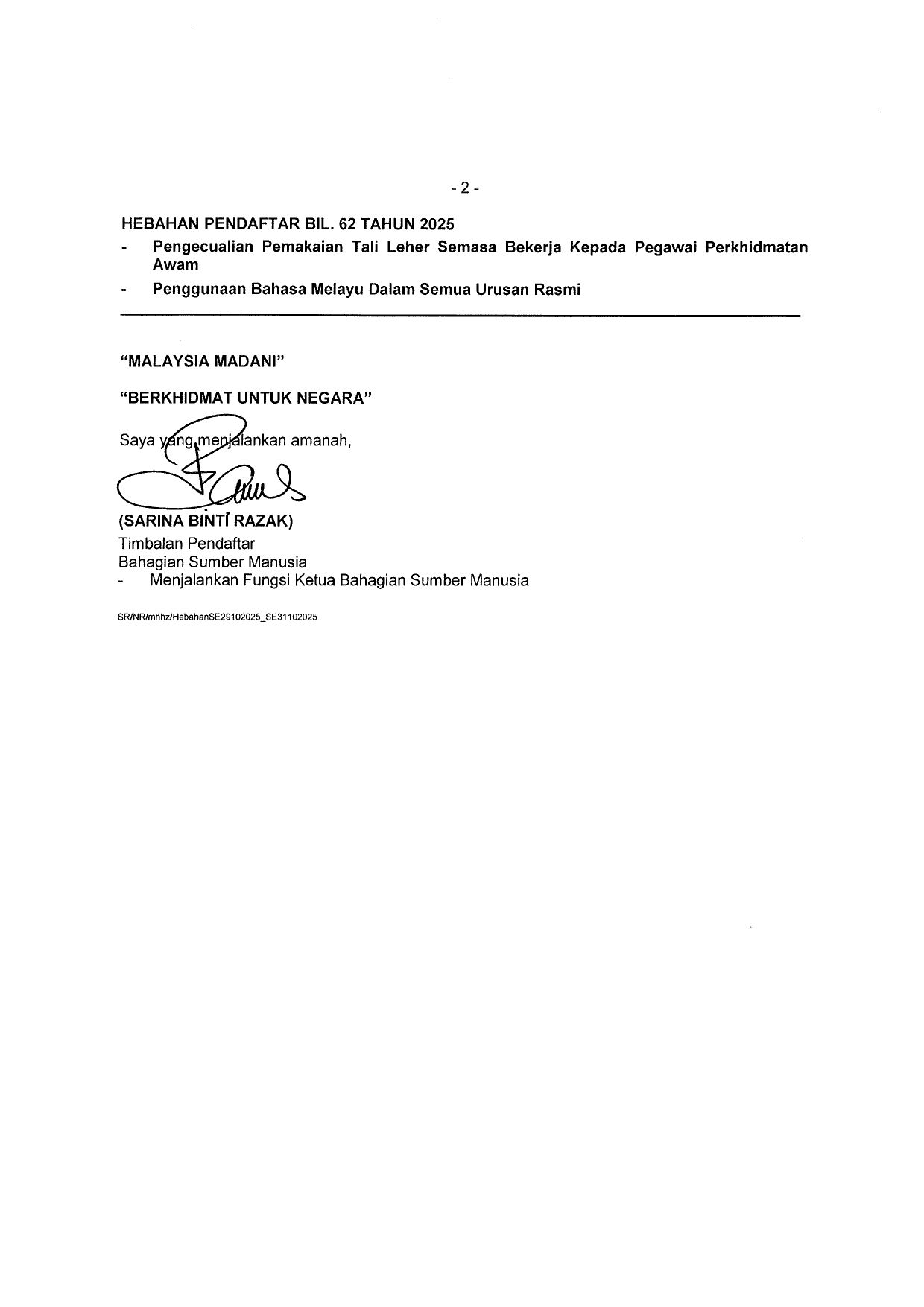 HEBAHAN PENDAFTAR BILANGAN 62 TAHUN 2025 - PENGGUNAAN BAHASA MELAYU DALAM SEMUA URUSAN RASMI DAN PENGECUALIAN PEMAKAIAN TALI LEHER SEMASA BEKERJA KEPADA PEGAWAI PERKHIDMATAN AWAM