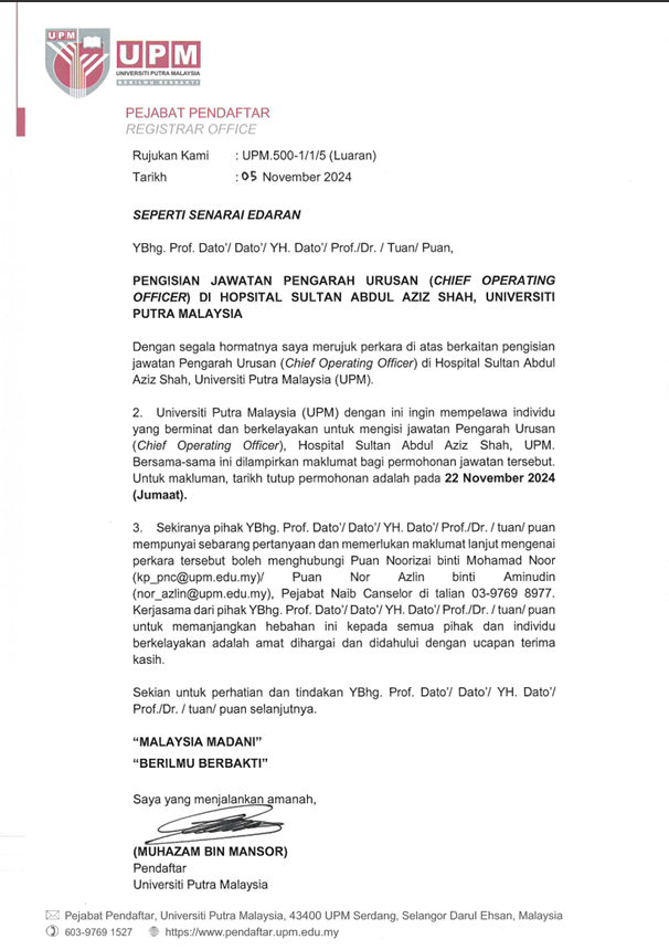 • HEBAHAN PENGISIAN JAWATAN PENGARAH URUSAN (CHIEF OPERATING OFFICER) HOSPITAL SULTAN ABDUL AZIZ SHAH, UNIVERSITI PUTRA MALAYSIA (UPM)