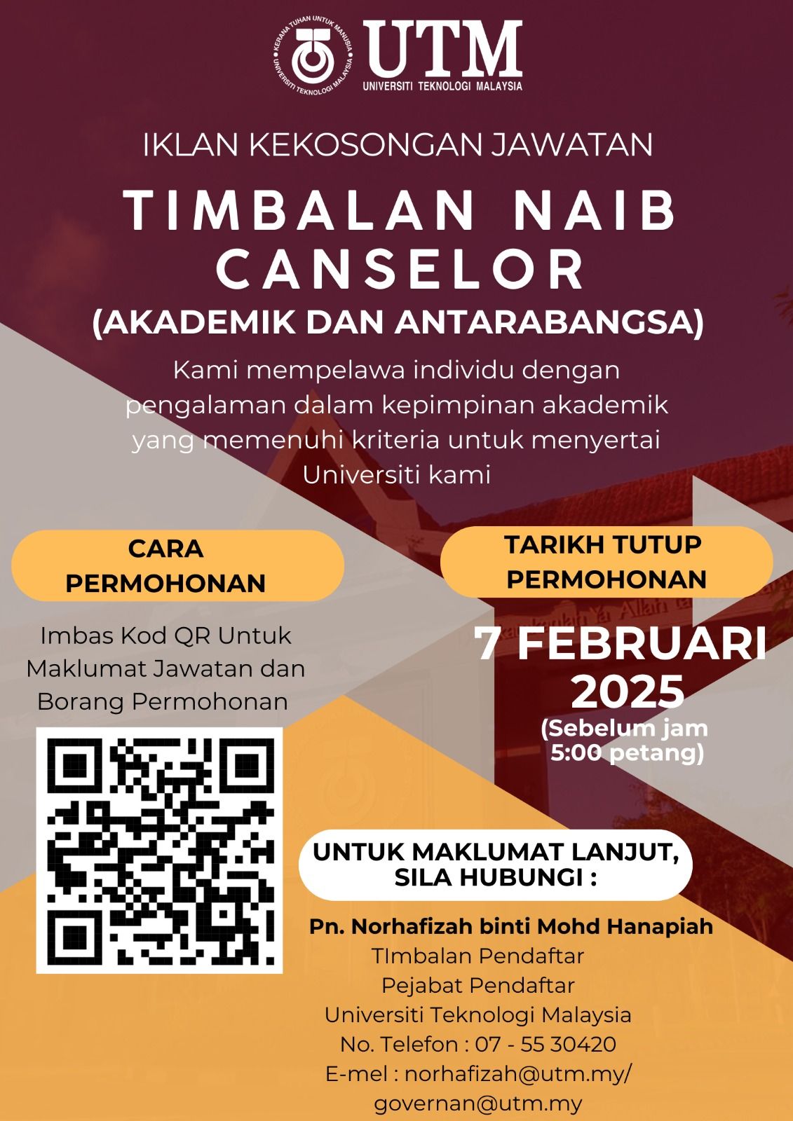 • HEBAHAN UMUM : IKLAN KEKOSONGAN JAWATAN TIMBALAN NAIB CANSELOR (AKADEMIK DAN ANTARABANGSA) UNIVERSITI TEKNOLOGI MALAYSIA