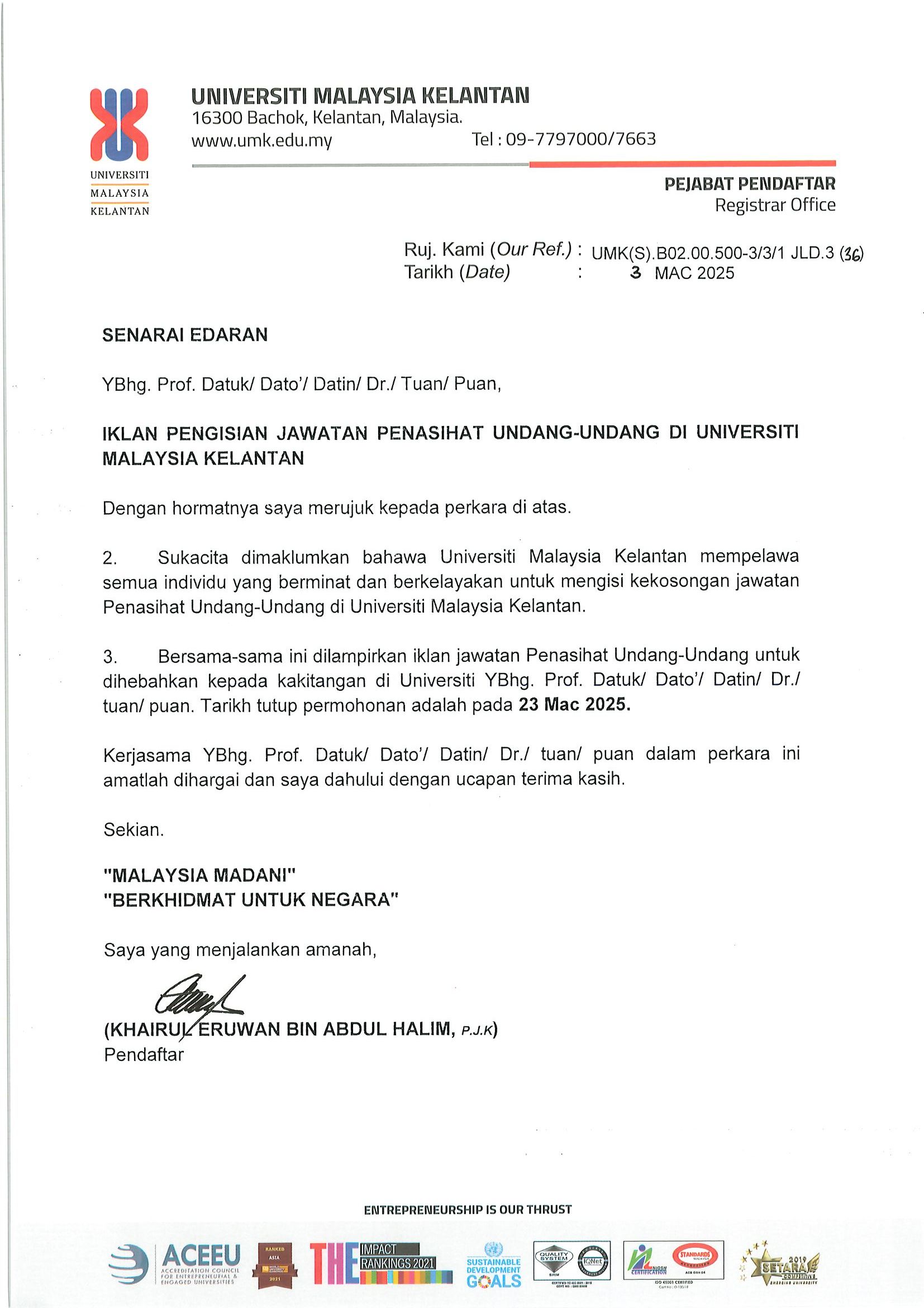 • HEBAHAN UMUM : IKLAN PENGISIAN JAWATAN PENASIHAT UNDANG-UNDANG DI UNIVERSITI MALAYSIA KELANTAN
