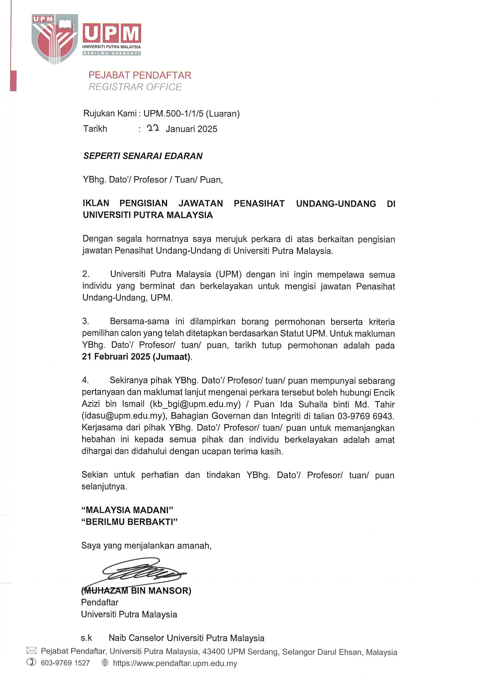 • HEBAHAN UMUM : IKLAN PENGISIAN JAWATAN PENASIHAT UNDANG-UNDANG DI UNIVERSITI PUTRA MALAYSIA (UPM)