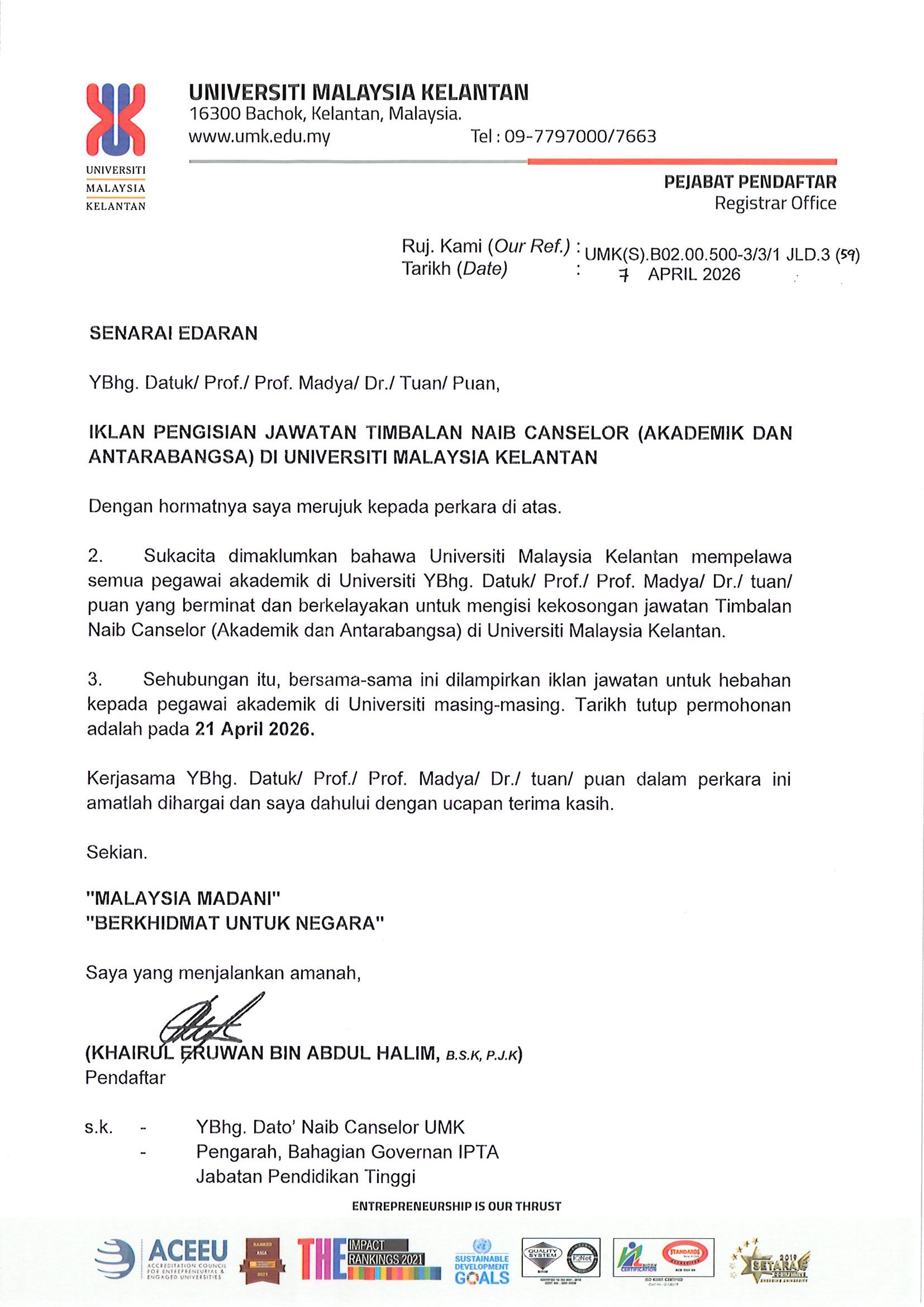 • HEBAHAN UMUM : IKLAN PENGISIAN JAWATAN TIMBALAN NAIB CANSELOR (AKADEMIK DAN ANTARABANGSA) DI UNIVERSITI MALAYSIA KELANTAN