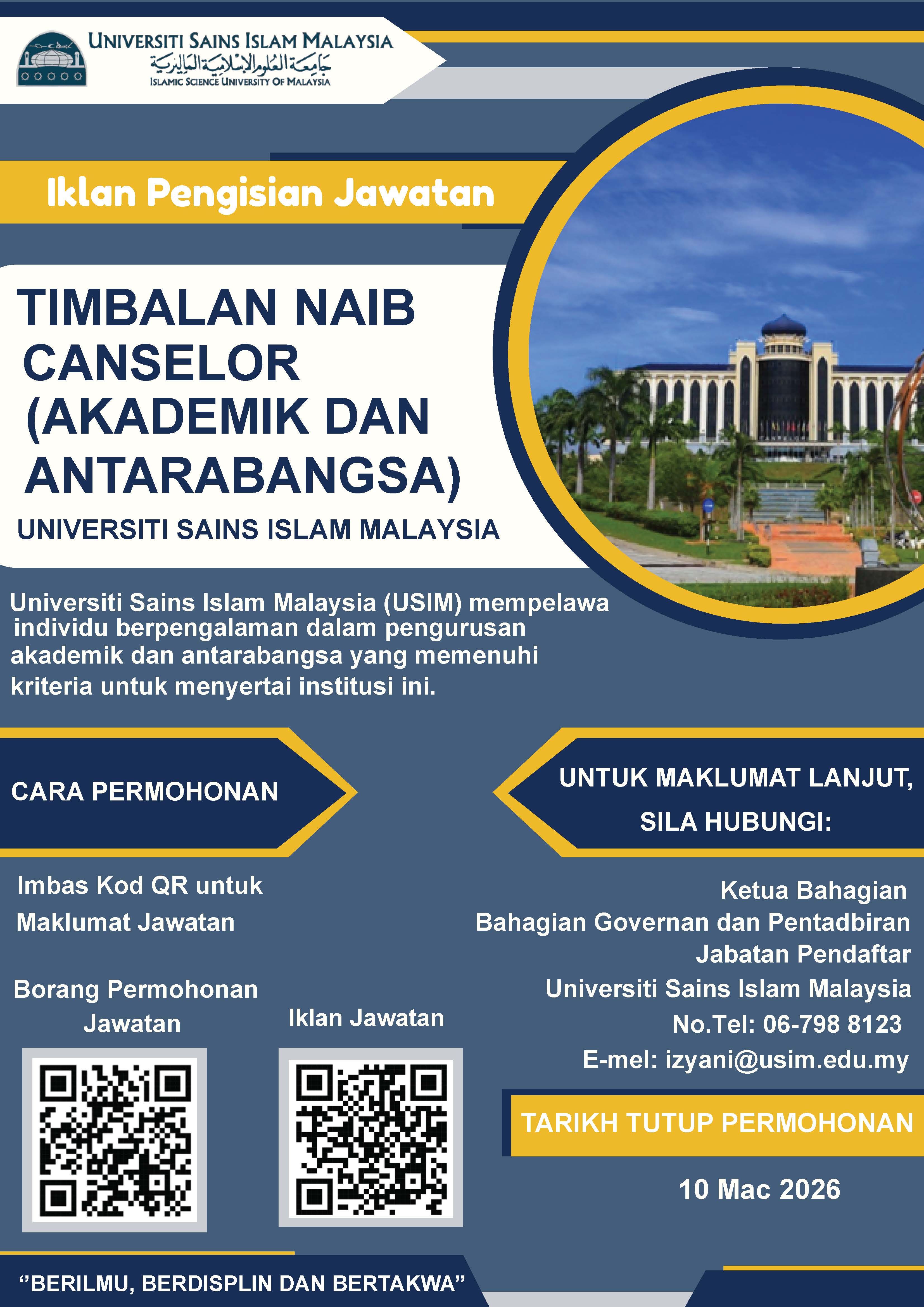• HEBAHAN UMUM : IKLAN PENGISIAN JAWATAN TIMBALAN NAIB CANSELOR (AKADEMIK DAN ANTARABANGSA) DI UNIVERSITI SAINS ISLAM MALAYSIA