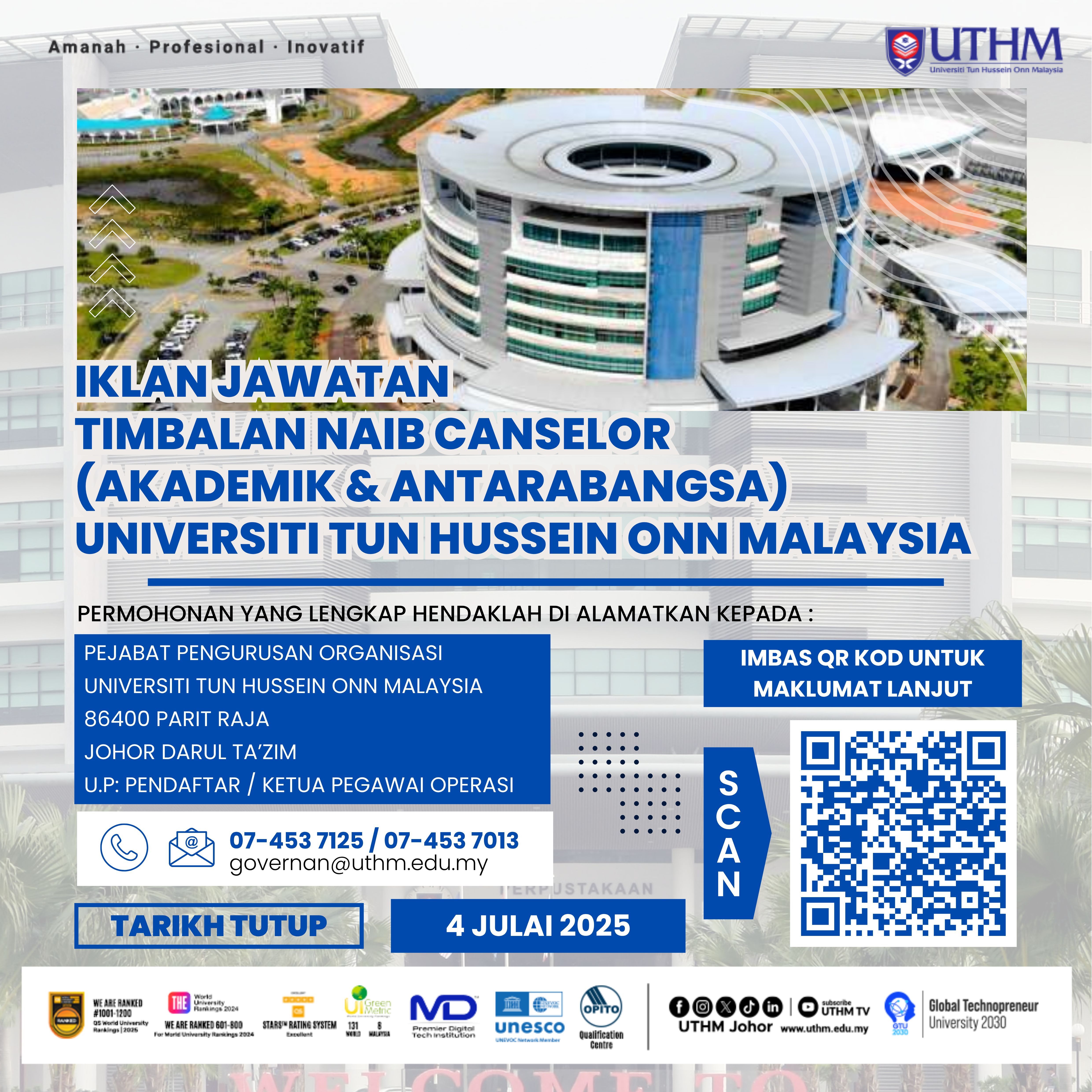 HEBAHAN UMUM : IKLAN PENGISIAN JAWATAN TIMBALAN NAIB CANSELOR (AKADEMIK DAN ANTARABANGSA) UNIVERSITI TUN HUSSEIN ONN MALAYSIA