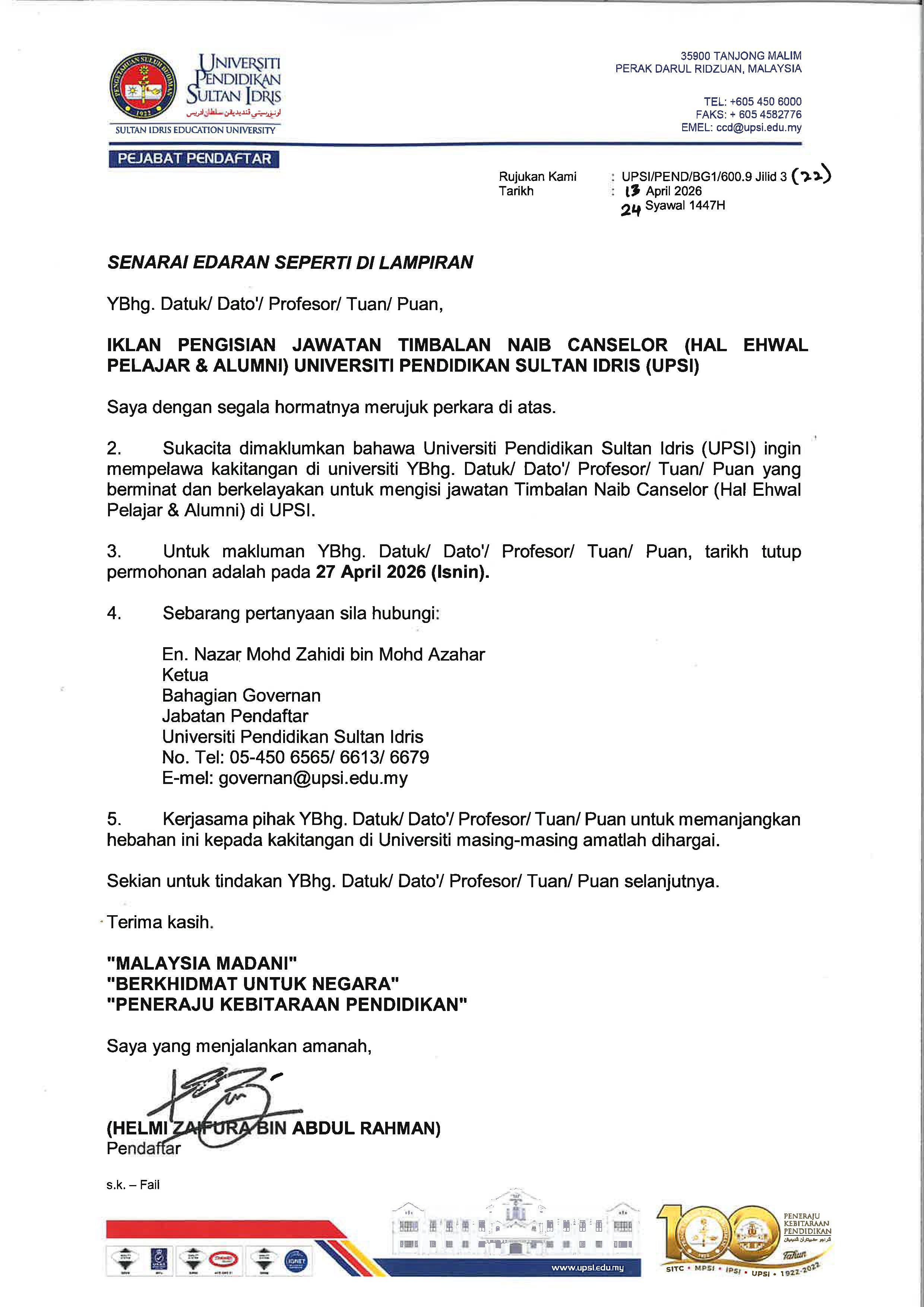 • HEBAHAN UMUM : IKLAN PENGISIAN JAWATAN TIMBALAN NAIB CANSELOR (HAL EHWAL PELAJAR & ALUMNI) UNIVERSITI PENDIDIKAN SULTAN IDRIS (UPSI)