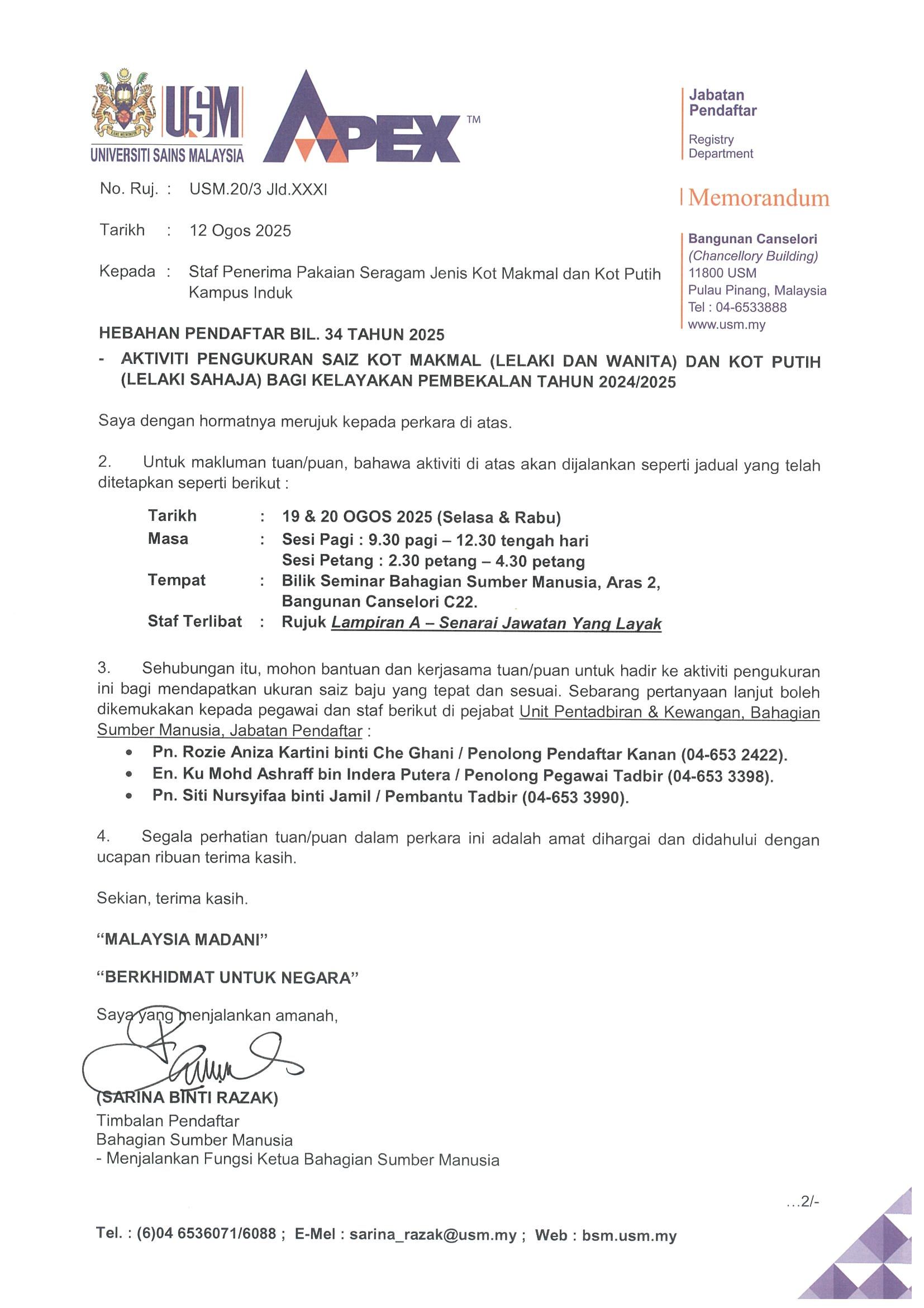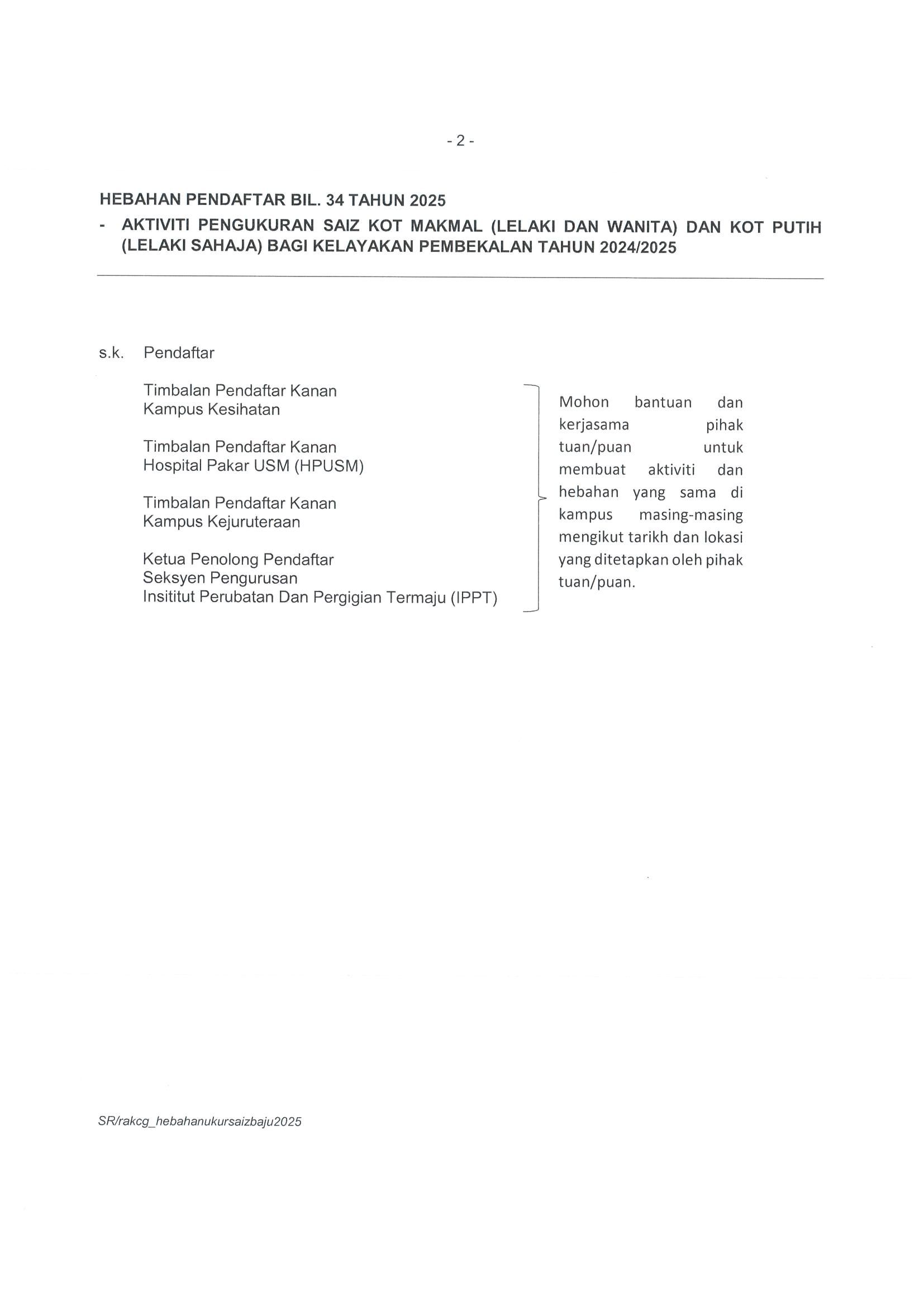 HEBAHAN PENDAFTAR BIL. 34 TAHUN 2025 - AKTIVITI PENGUKURAN SAIZ KOT MAKMAL (LELAKI DAN WANITA) DAN KOT PUTIH (LELAKI SAHAJA) BAGI KELAYAKAN PEMBEKALAN TAHUN 2024/2025