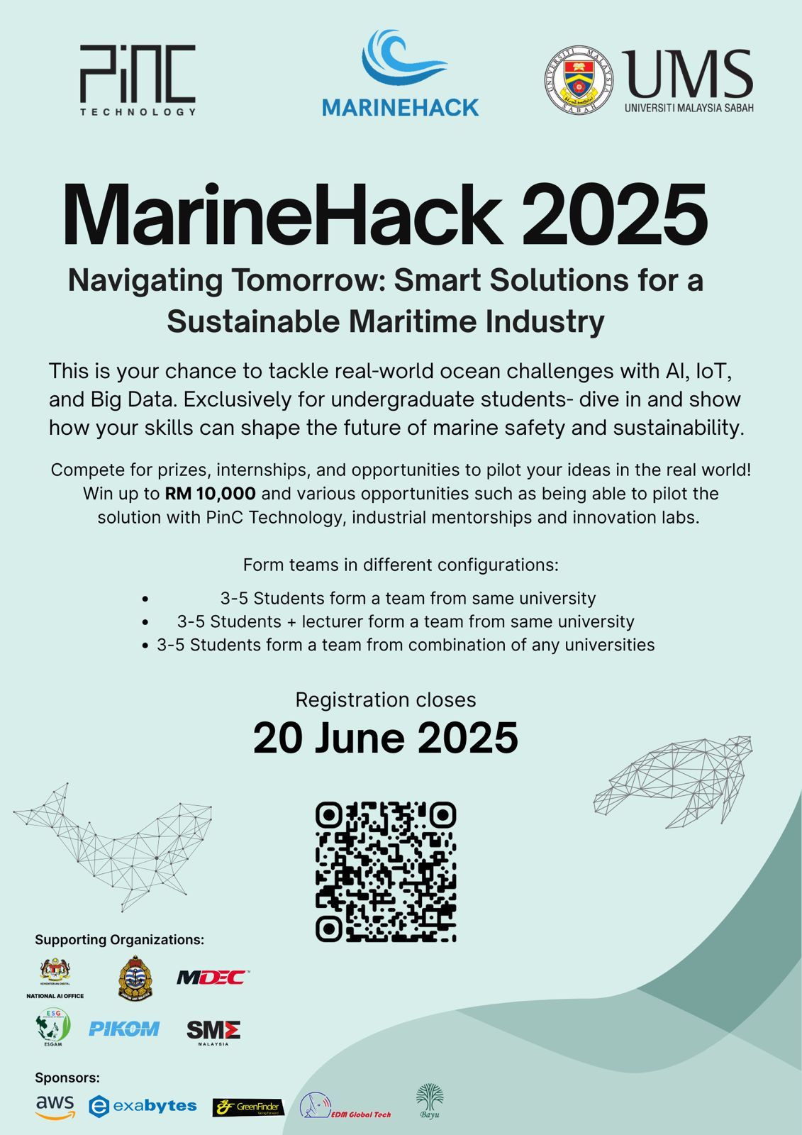 #MarineHack2025 #PinCTechnology #UMS #InnovationAtSea #AIForOceans #MaritimeTech #HackForImpact #MalaysiaTech #SustainableSeas