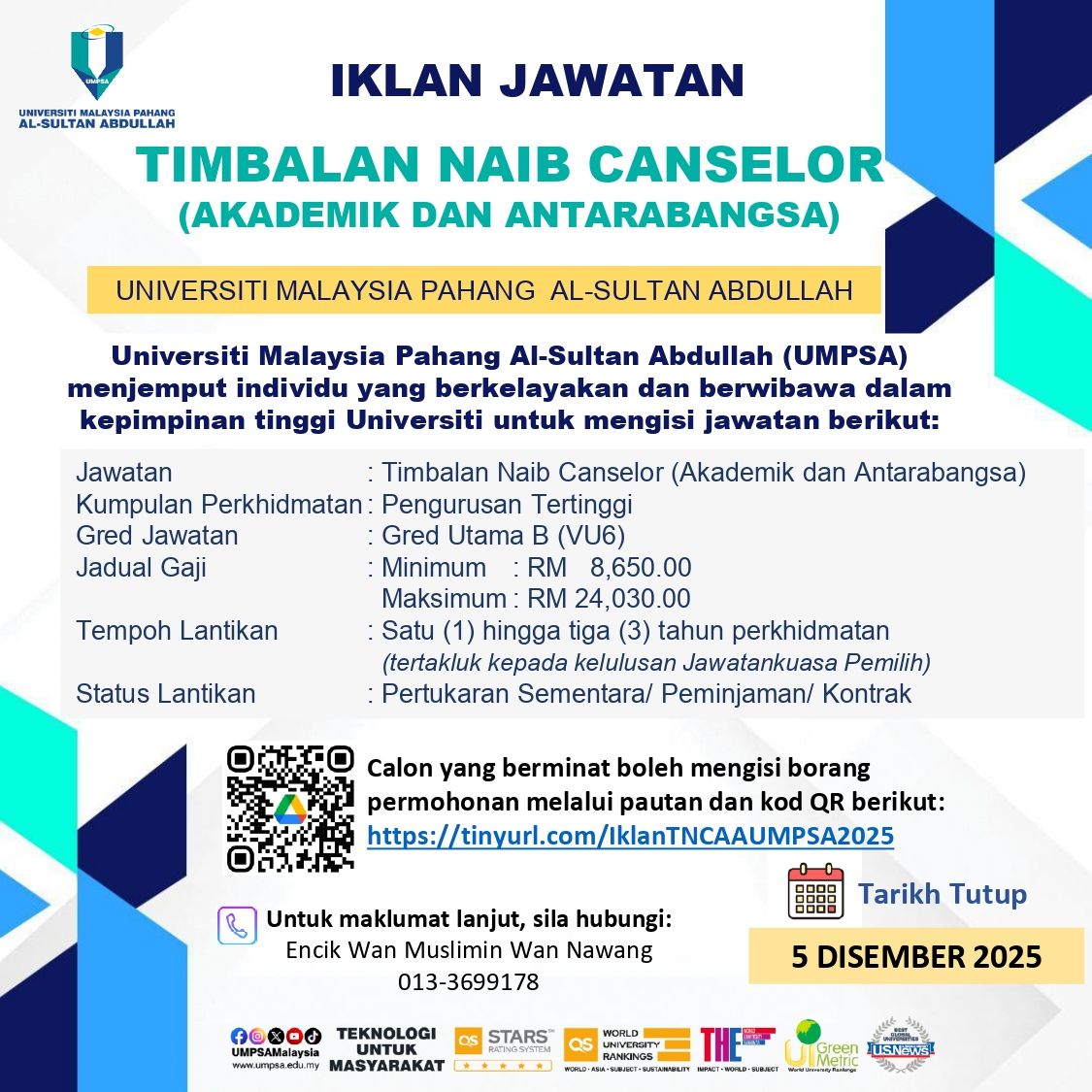• HEBAHAN UMUM : PELAWAAN UNTUK MENGISI JAWATAN TIMBALAN NAIB CANSELOR (AKADEMIK DAN ANTARABANGSA) DI UNIVERSITI MALAYSIA PAHANG AL-SULTAN ABDULLAH (UMPSA)