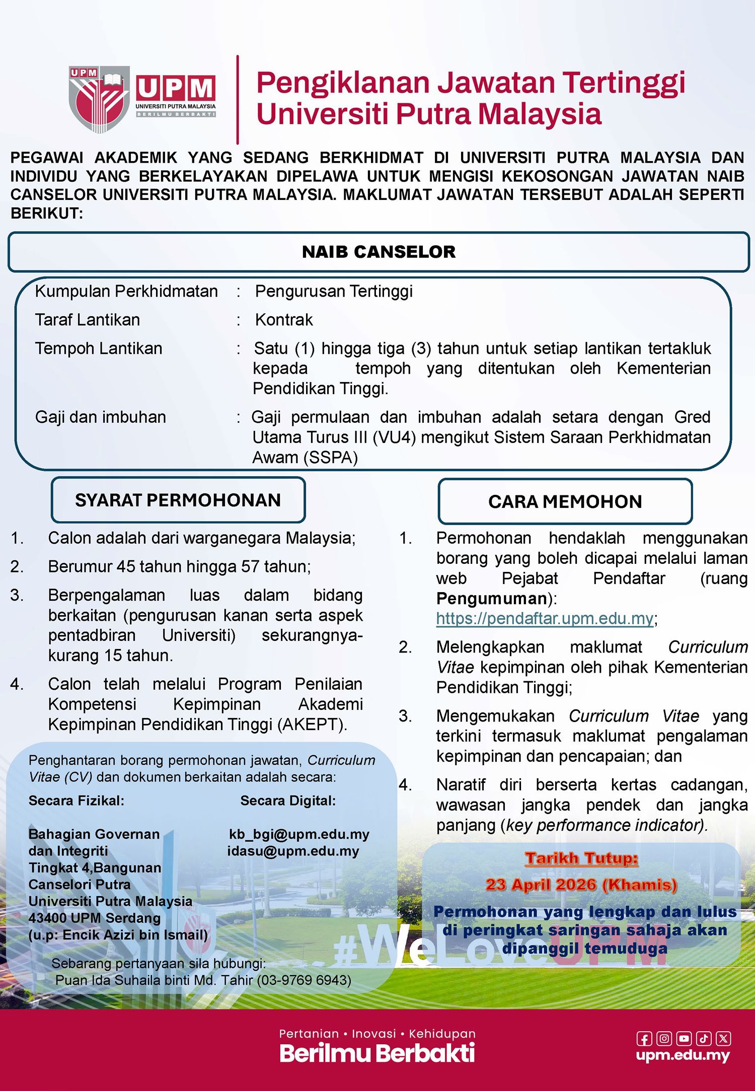 HEBAHAN UMUM : PENGISIAN JAWATAN NAIB CANSELOR UNIVERSITI PUTRA MALAYSIA