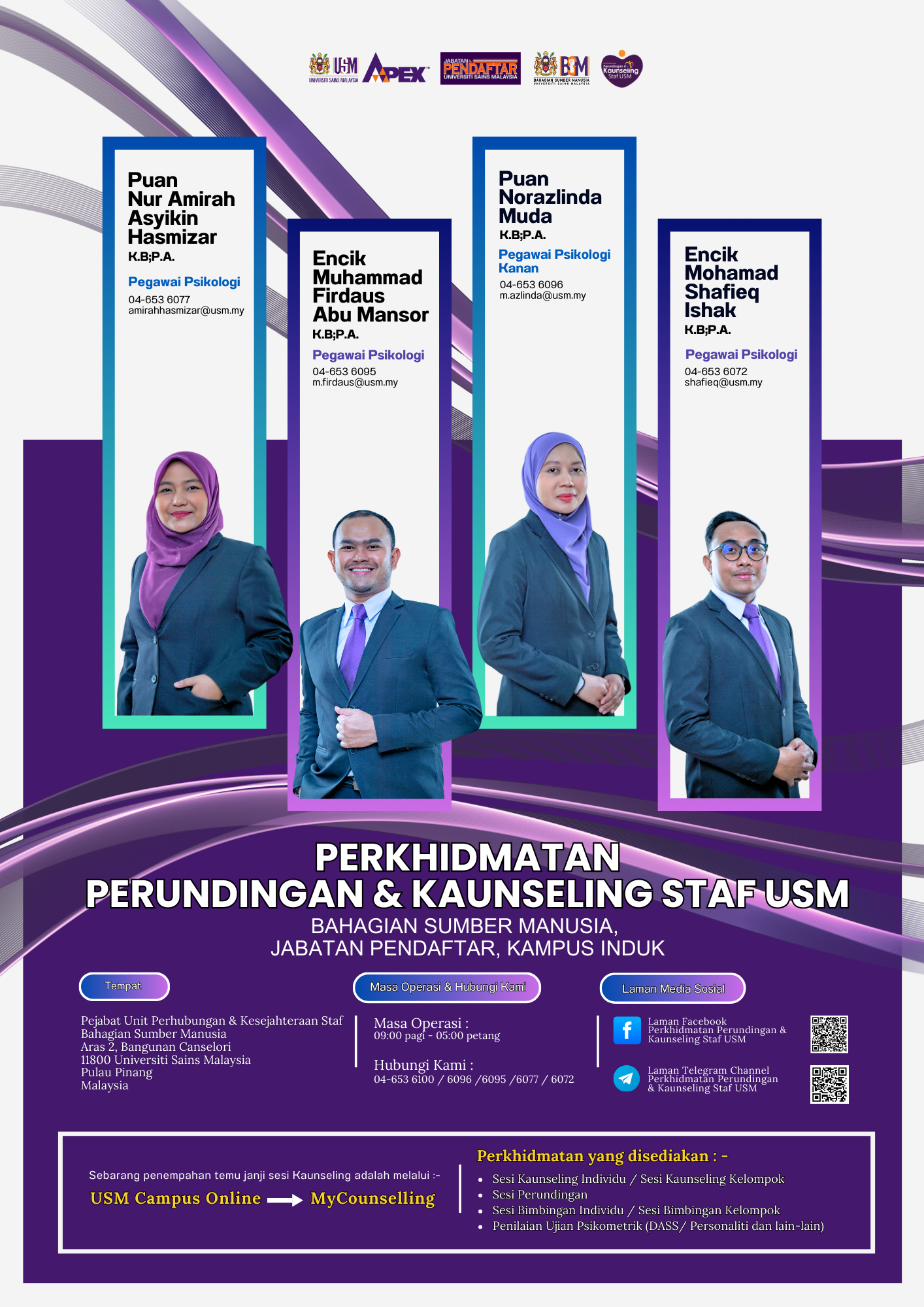 Sukacita dimaklumkan bahawa Universiti Sains Malaysia melalui Bahagian Sumber Manusia, Jabatan Pendaftar, Kampus Induk berbesar hati menawarkan Perkhidmatan Perundingan & Kaunseling kepada seluruh warga Staf USM. Perkhidmatan ini merupakan inisiatif Universiti bagi membantu staf mengurus isu-isu kesejahteraan psikologi dan emosi, tekanan kerja, hubungan interpersonal, keseimbangan kerja dan kehidupan, serta pelbagai cabaran lain.
