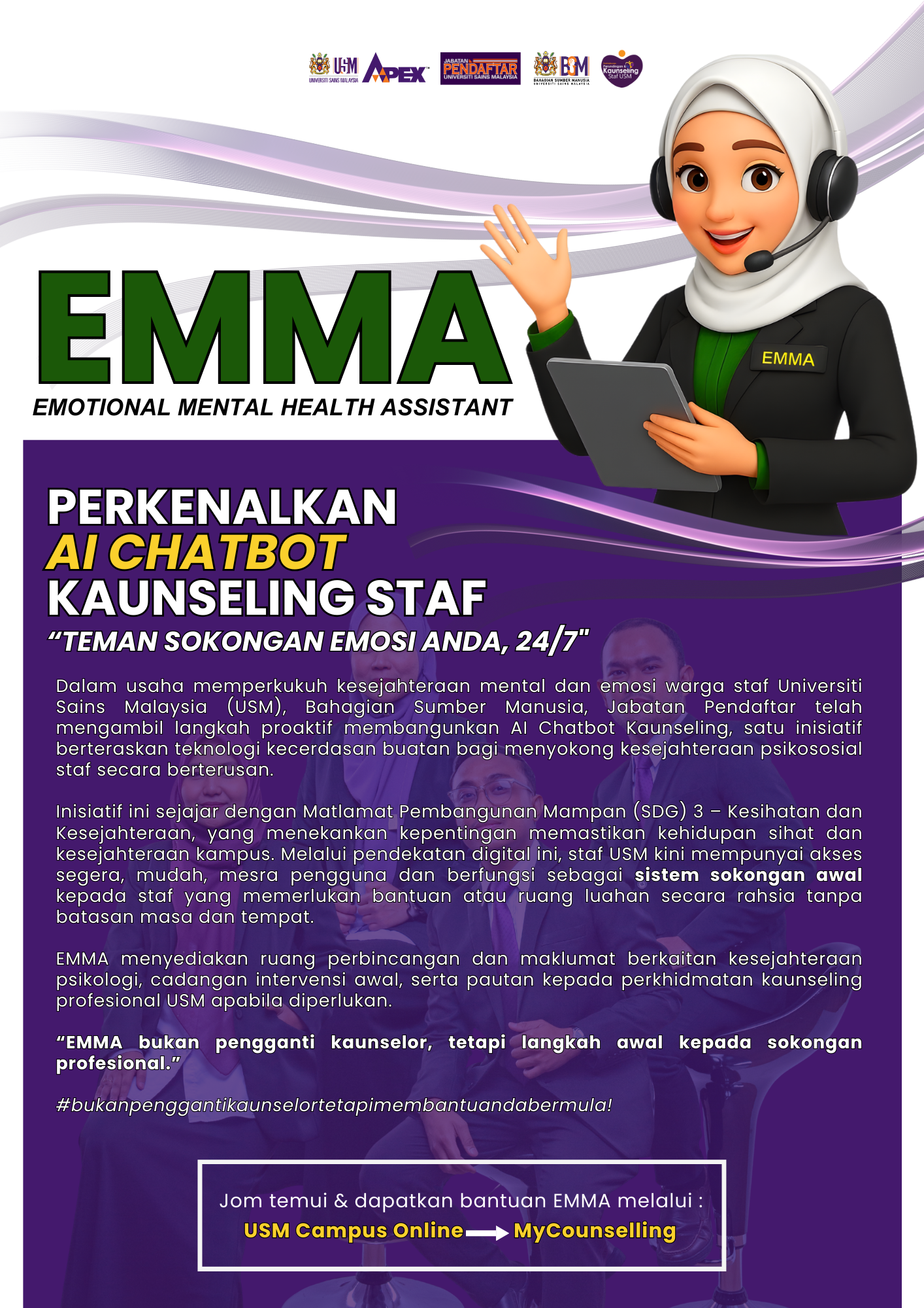 Dalam usaha memperkukuh kesejahteraan mental dan emosi warga staf USM, Bahagian Sumber Manusia, Jabatan Pendaftar turut mengambil langkah proaktif membangunkan EMMA – AI Chatbot Kaunseling, sebuah inisiatif berteraskan teknologi kecerdasan buatan bagi menyokong kesejahteraan psikososial staf secara berterusan. Inisiatif ini selaras dengan Matlamat Pembangunan Mampan (SDG) 3 – Kesihatan dan Kesejahteraan, yang menekankan kepentingan memastikan kehidupan sihat dan kesejahteraan komuniti kampus.