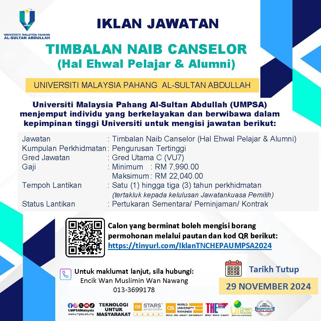• PELAWAAN UNTUK MENGISI JAWATAN TIMBALAN NAIB CANSELOR (HAL EHWAL PELAJAR DAN ALUMNI) DI UNIVERSITI MALAYSIA PAHANG AL-SULTAN ABDULLAH (UMPSA)