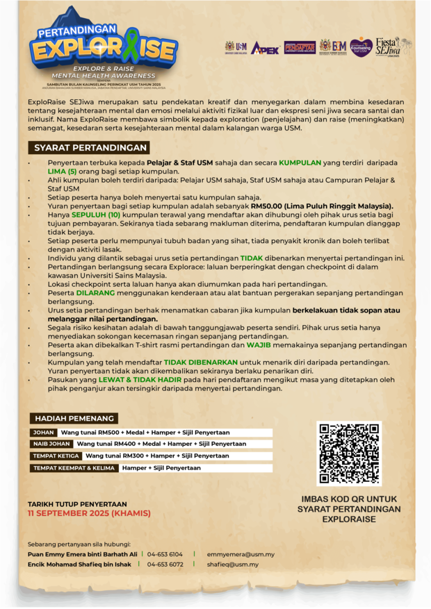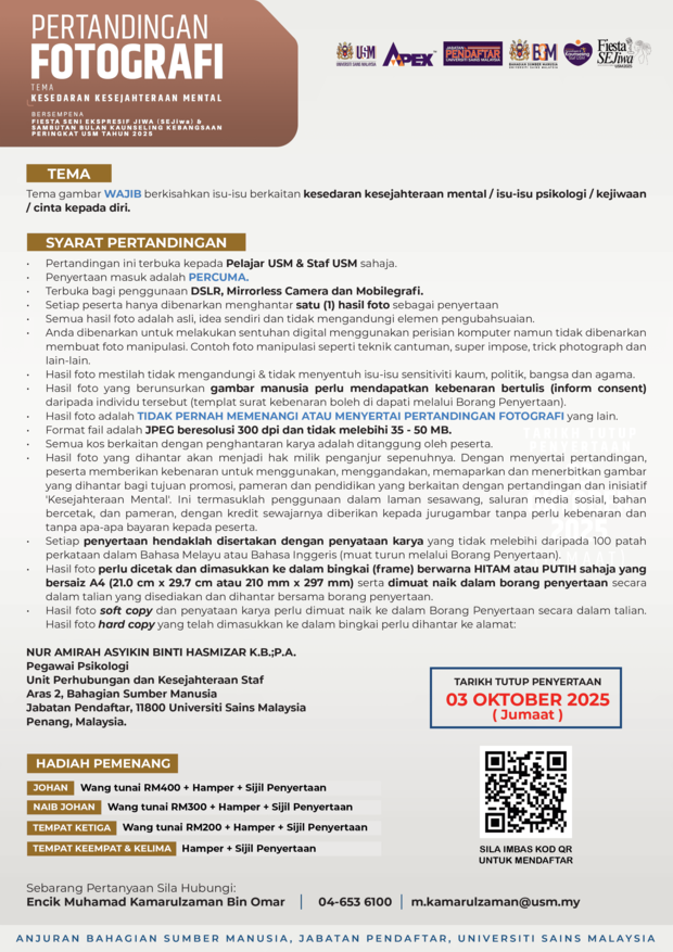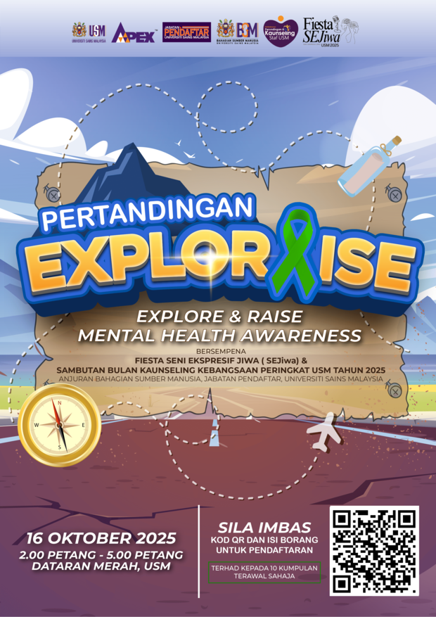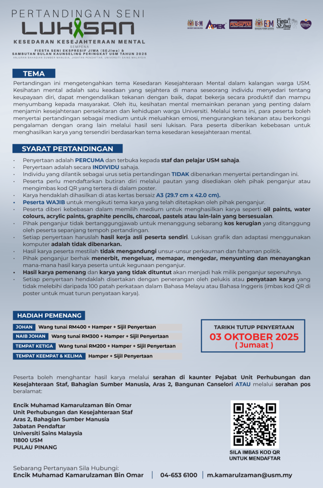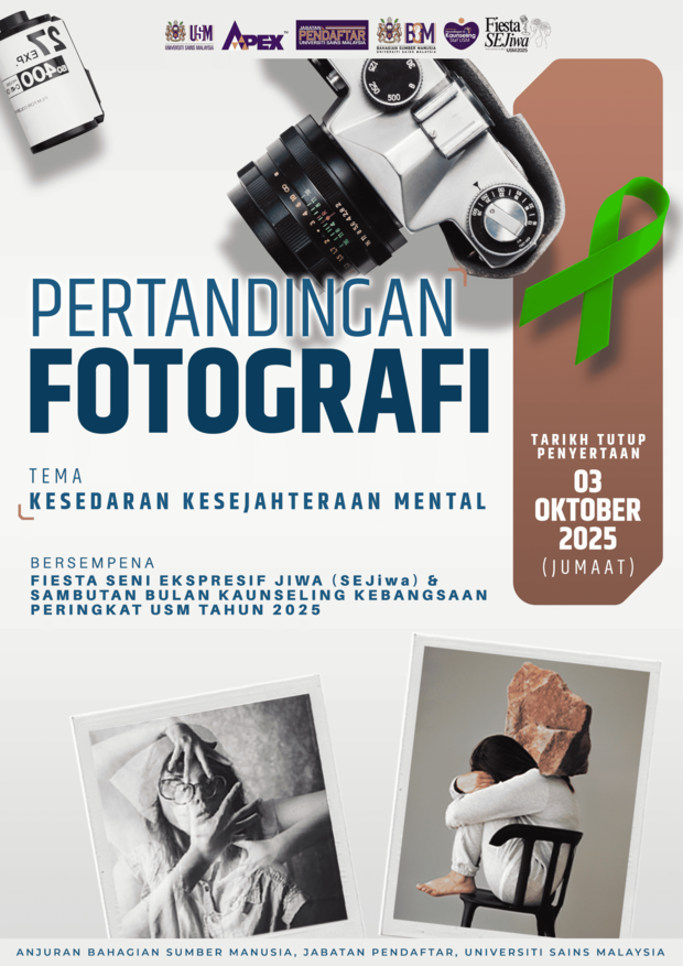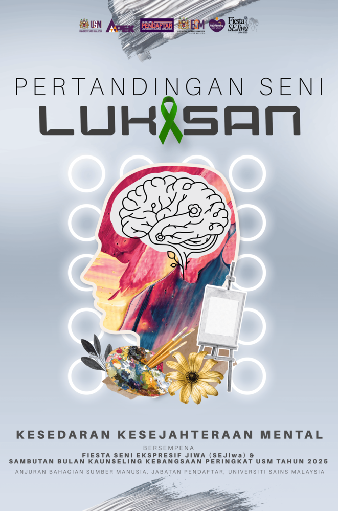 Adalah dengan ini dimaklumkan bahawa Bahagian Sumber Manusia, Jabatan Pendaftar, Universiti Sains Malaysia akan menganjurkan Fiesta Seni Ekspresif Jiwa (SEJiwa) bersempena Sambutan Bulan Kaunseling Kebangsaan Peringkat Universiti Sains Malaysia Tahun 2025 yang akan mempertandingkan empat (4) kategori pertandingan iaitu Nyanyian (SEJiwa Voice), Seni Lukisan, Fotografi dan ExploRaise bertemakan kesedaran kesejahteraan mental dengan penyertaan daripada pelajar & staf USM serta orang awam.