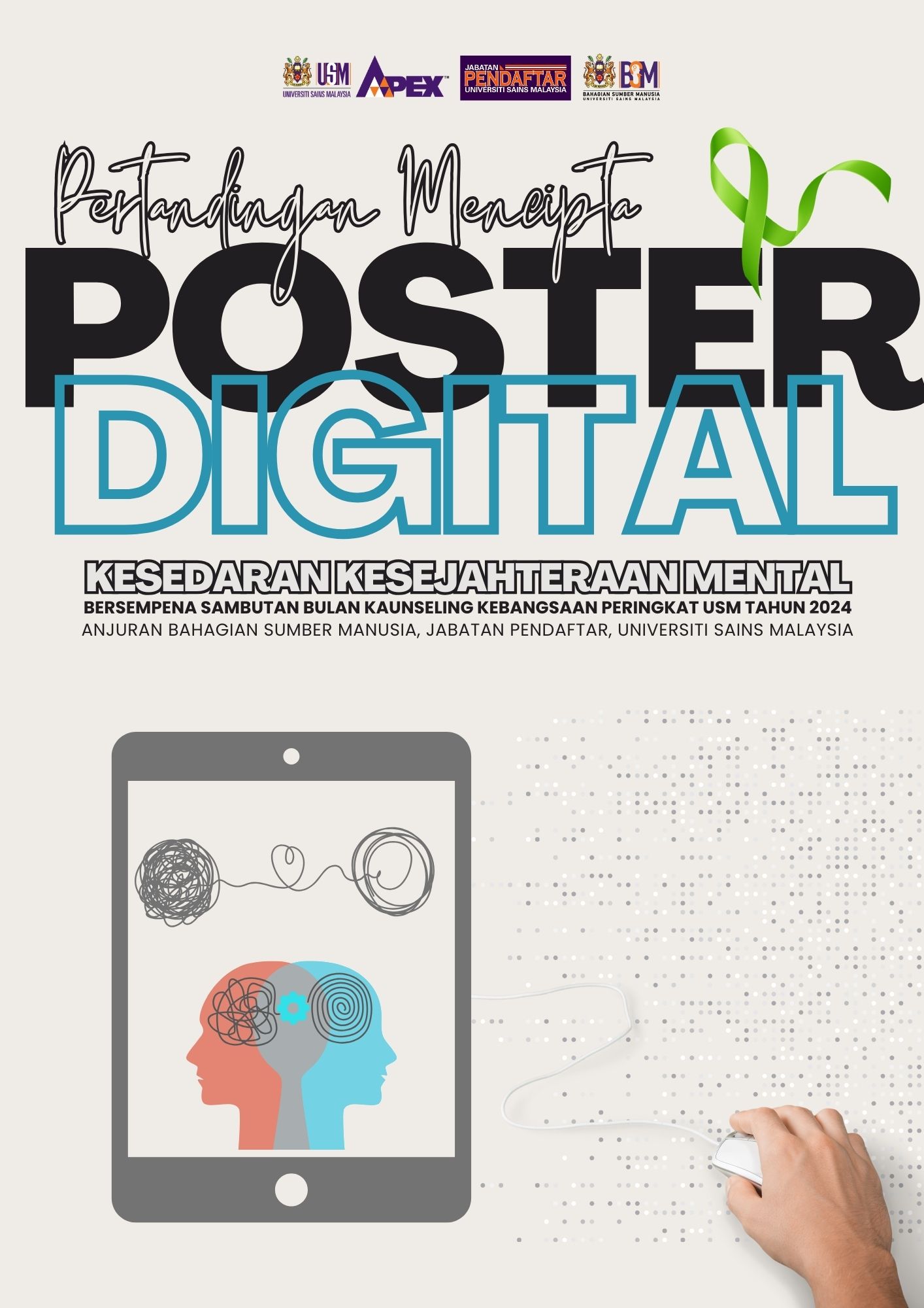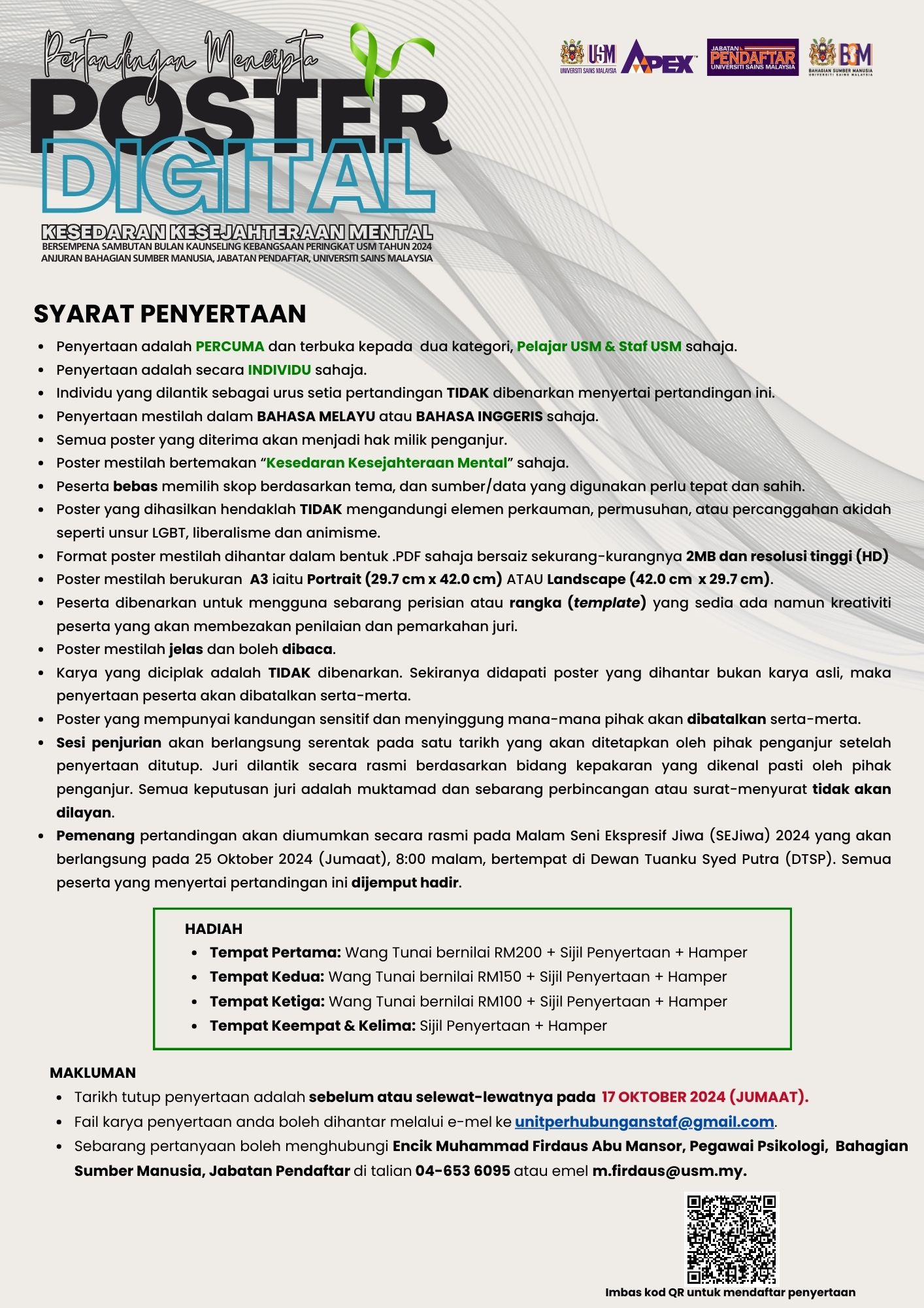 Sehubungan dengan itu, Bahagian ini berbesar hati menjemput warga staf dan pelajar USM untuk menyertai Pertandingan Seni Lukisan dan Mencipta Poster Digital yang bertemakan kesedaran kesejahteraan mental ini. Penyertaan adalah percuma. Bersama-sama e-mel ini dilampirkan poster program dan syarat-syarat pertandingan untuk perhatian dan rujukan YBhg. Datuk/Dato' Seri/Dato'/Datin/Prof./Tuan/Puan.