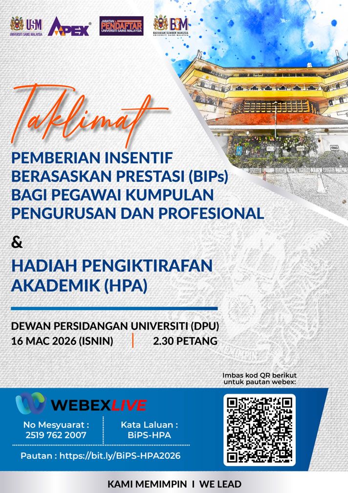 2. Sukacitanya dimaklumkan bahawa Bahagian Sumber Manusia (BSM), Jabatan Pendaftar akan mengadakan Taklimat Pemberian Insentif Berasaskan Prestasi (BIPs) bagi pegawai Kumpulan Pengurusan dan Profesional serta Hadiah Pengiktirafan Akademik (HPA).